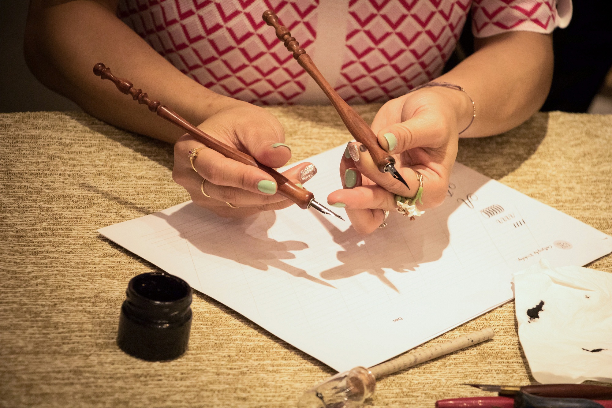 Kalo Chu從英式書法的歷史演變到書法筆桿筆尖的組裝、鑲嵌;再到握筆坐姿、墨水的蘸取、提筆勾字的角度技巧……事無巨細地進行了一一的講解