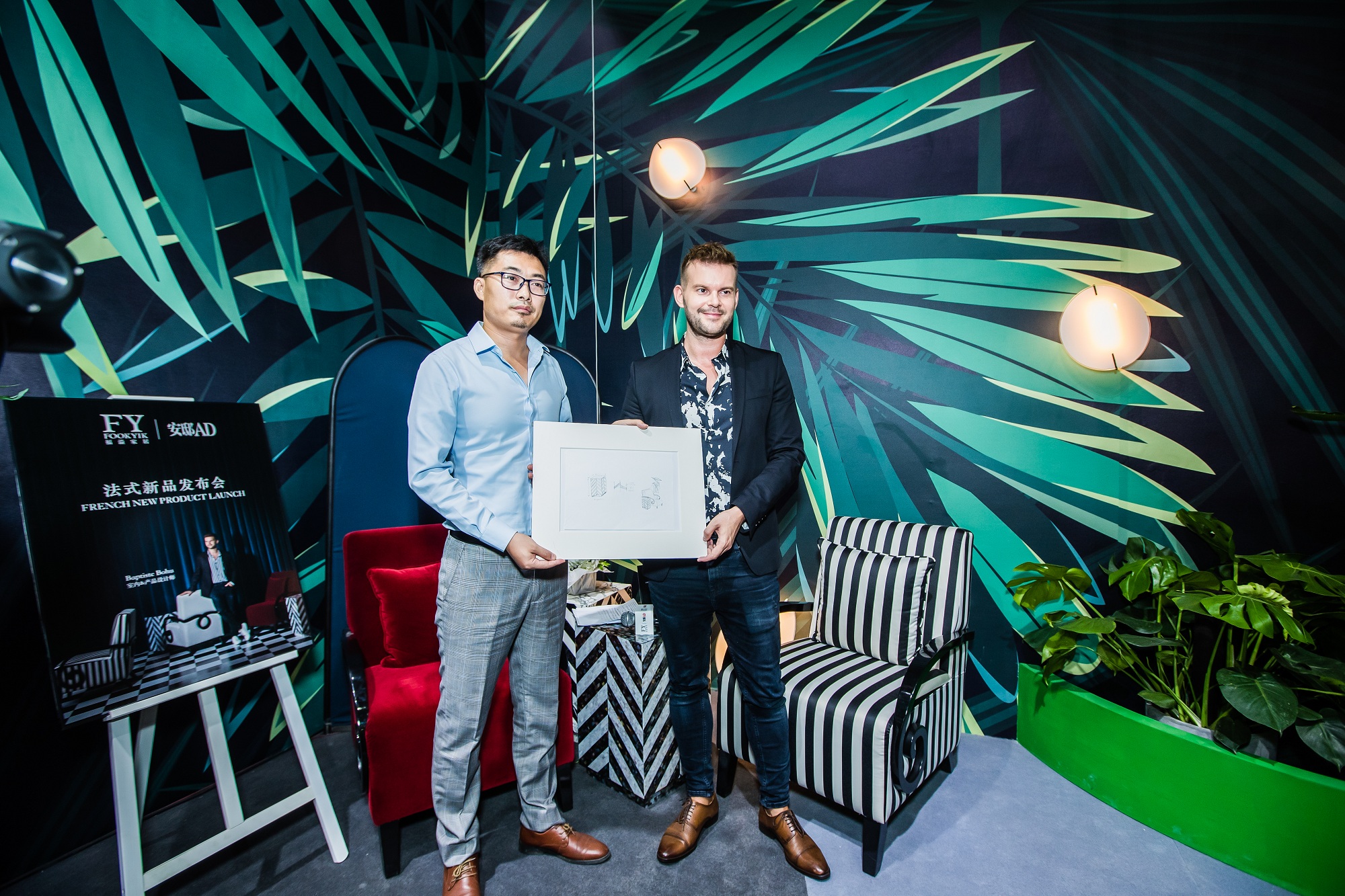 此次發(fā)布會還準備了一個特別的手稿交予環(huán)節(jié):設(shè)計師Baptiste Bohu將極具收藏價值,見證雙方第一次愉快合作的珍貴手稿轉(zhuǎn)交給福溢家居的趙忠杰先生。