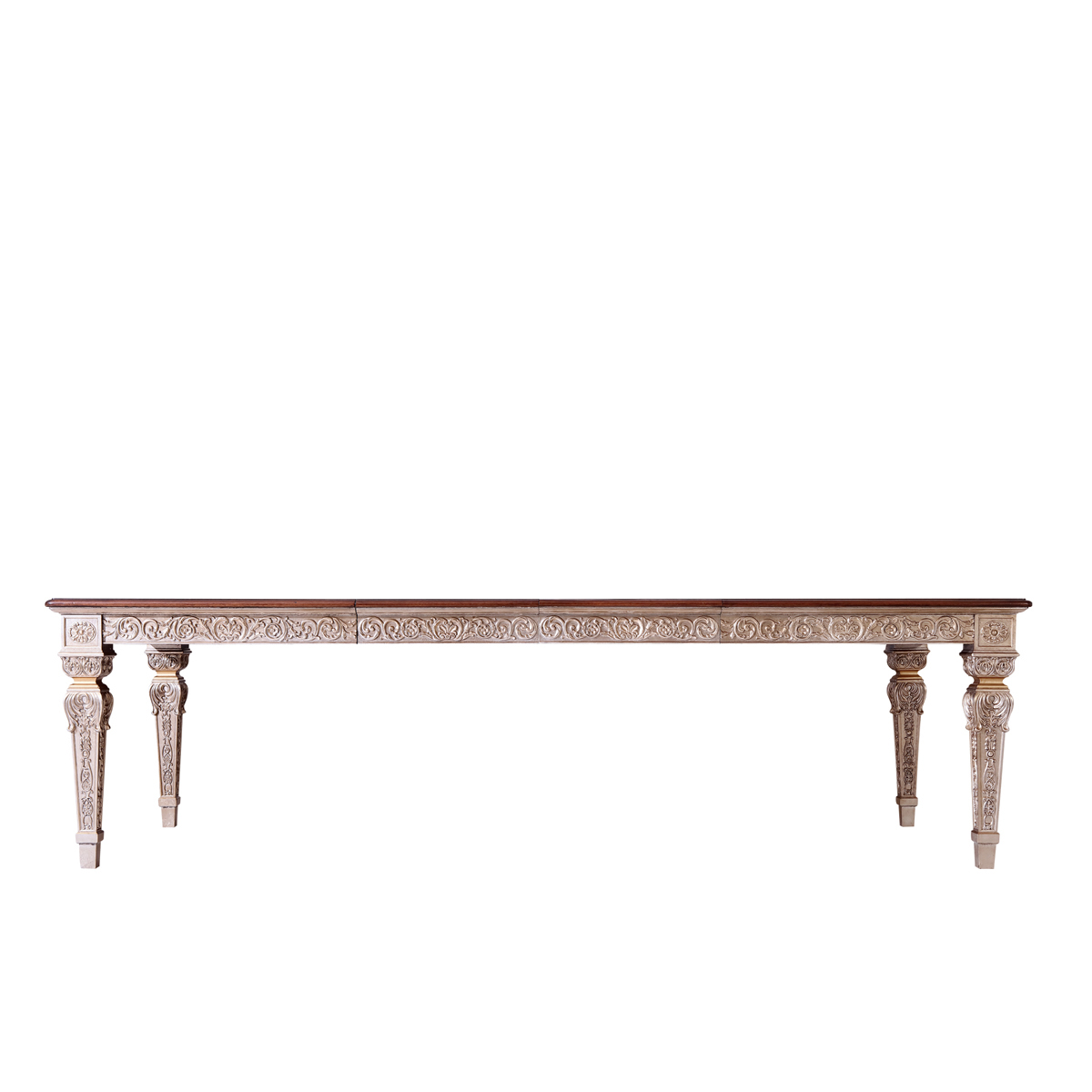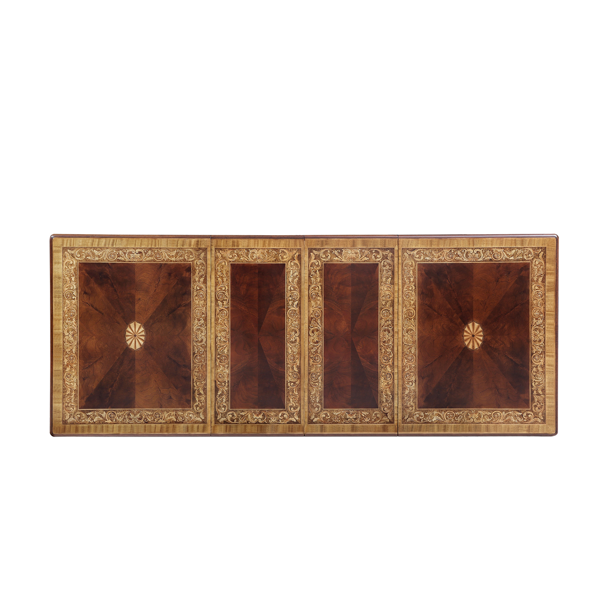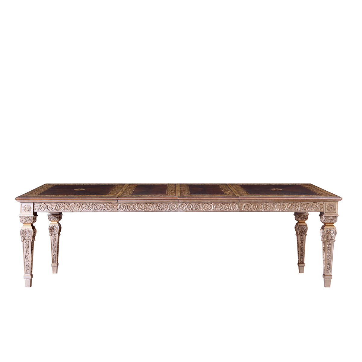 * 以現(xiàn)位于美國白宮中象征友誼和權(quán)力的堅毅桌(英語:Resolute desk)為設計意念, 以實木拼貼和雕刻工藝,將具有紀念意義的歷史時刻融入其中,實用性的功能設計更是把藝術和生活完美結(jié)合, 是宮廷系列華盛頓美式餐桌的特色。