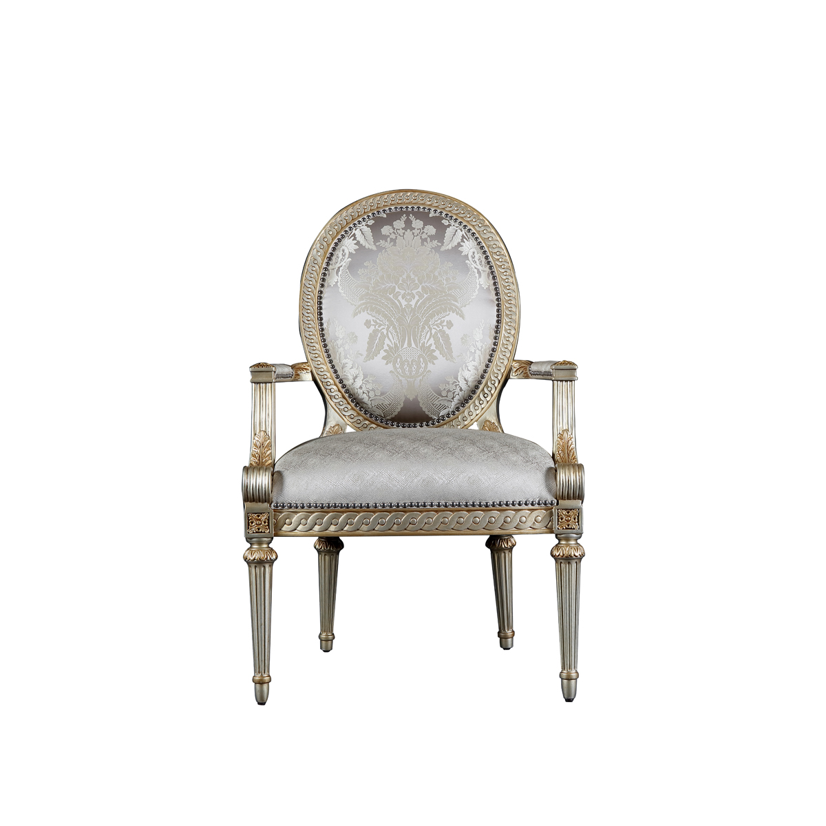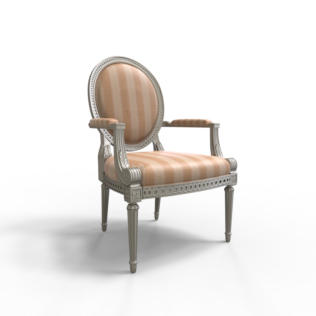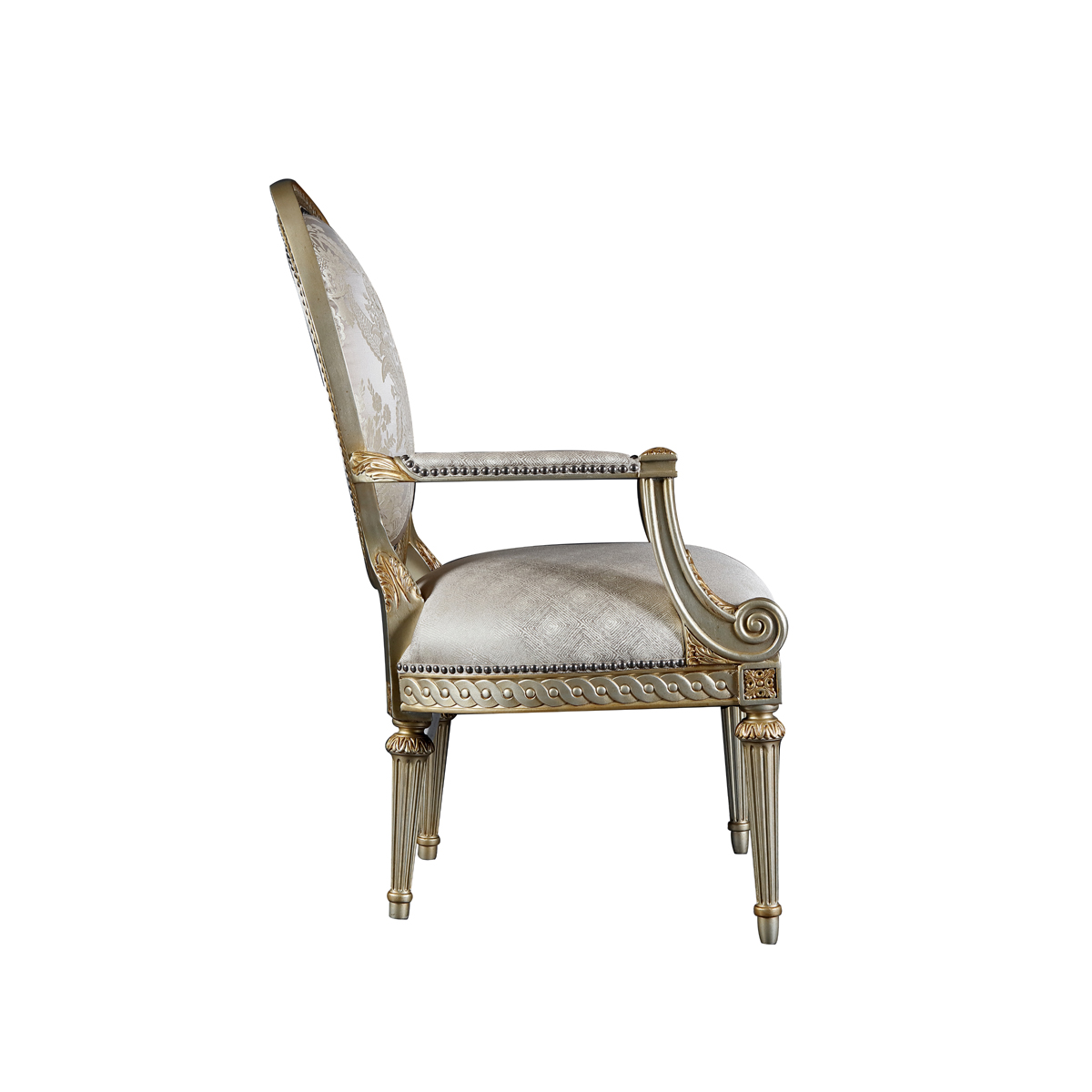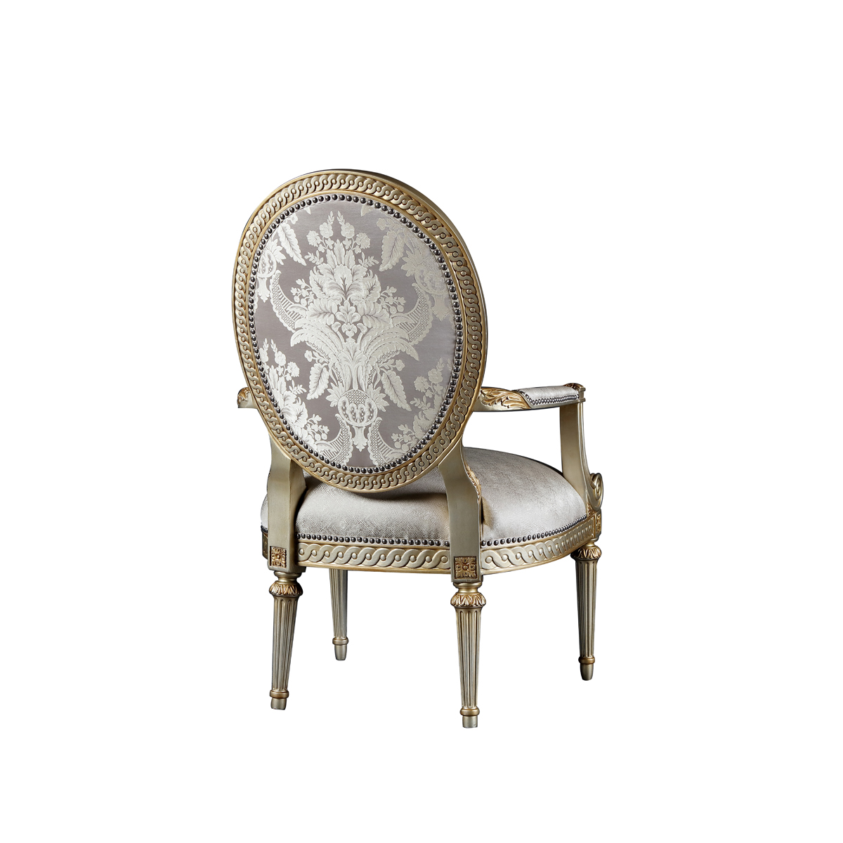 這款休閑椅是參考18世紀法國路易十六時期涂金扶手椅古董設計,并結合同時期的圓面背板設計。配上精致的連續雕刻、錐形腳設計、觸感舒適的布藝和包有豐厚的填充物坐墊和靠背。