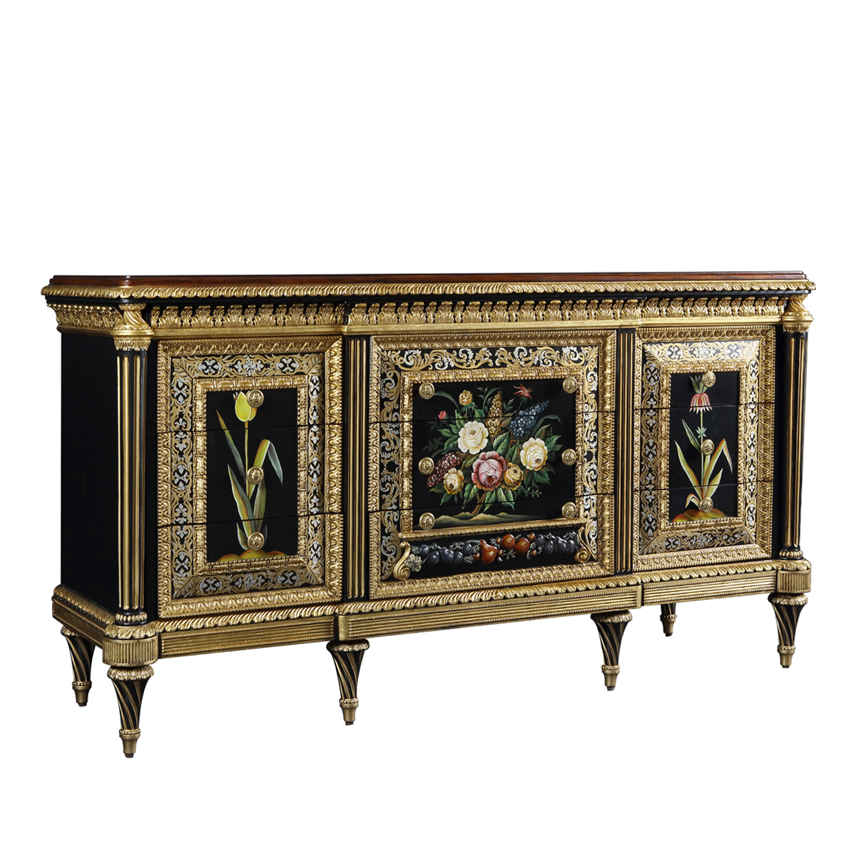 以英國溫莎堡中的新古典風格長柜為意念,設計出古典復刻版。絕美的植物彩繪和花朵蔓藤雕刻,撲捉溫莎城堡的淺谷繁花;英國皇室家具完美呈現,形象逼真地描繪了貴族家居生活美學的真諦。