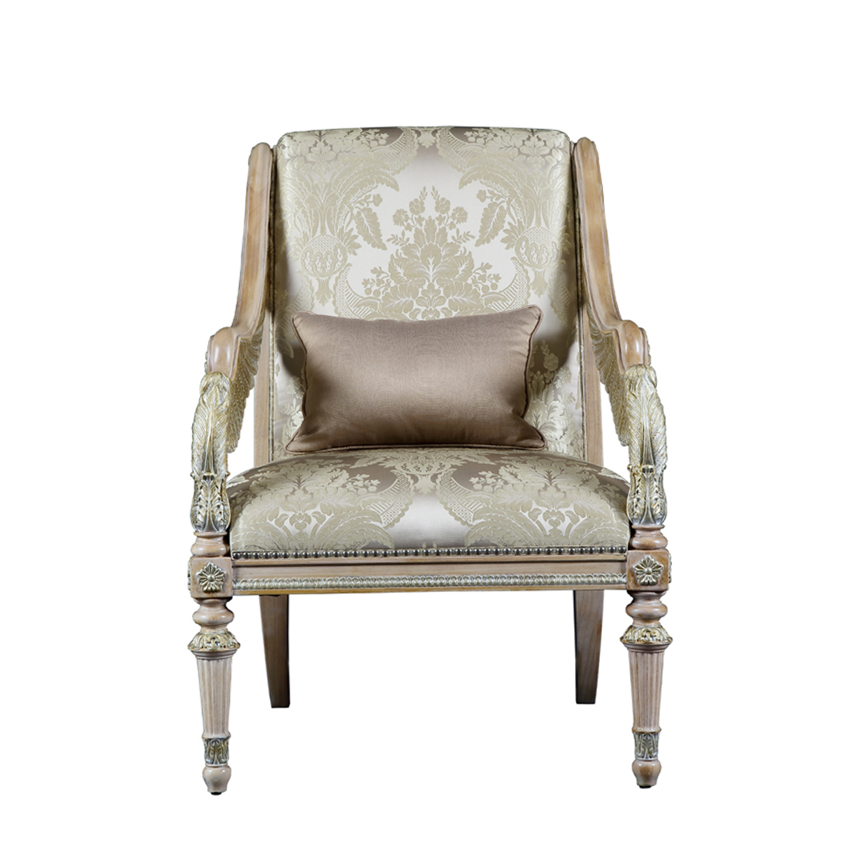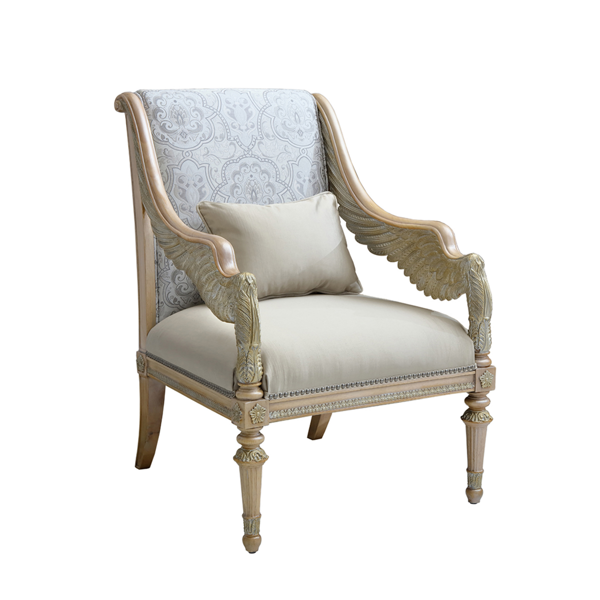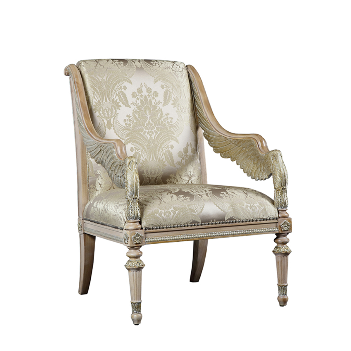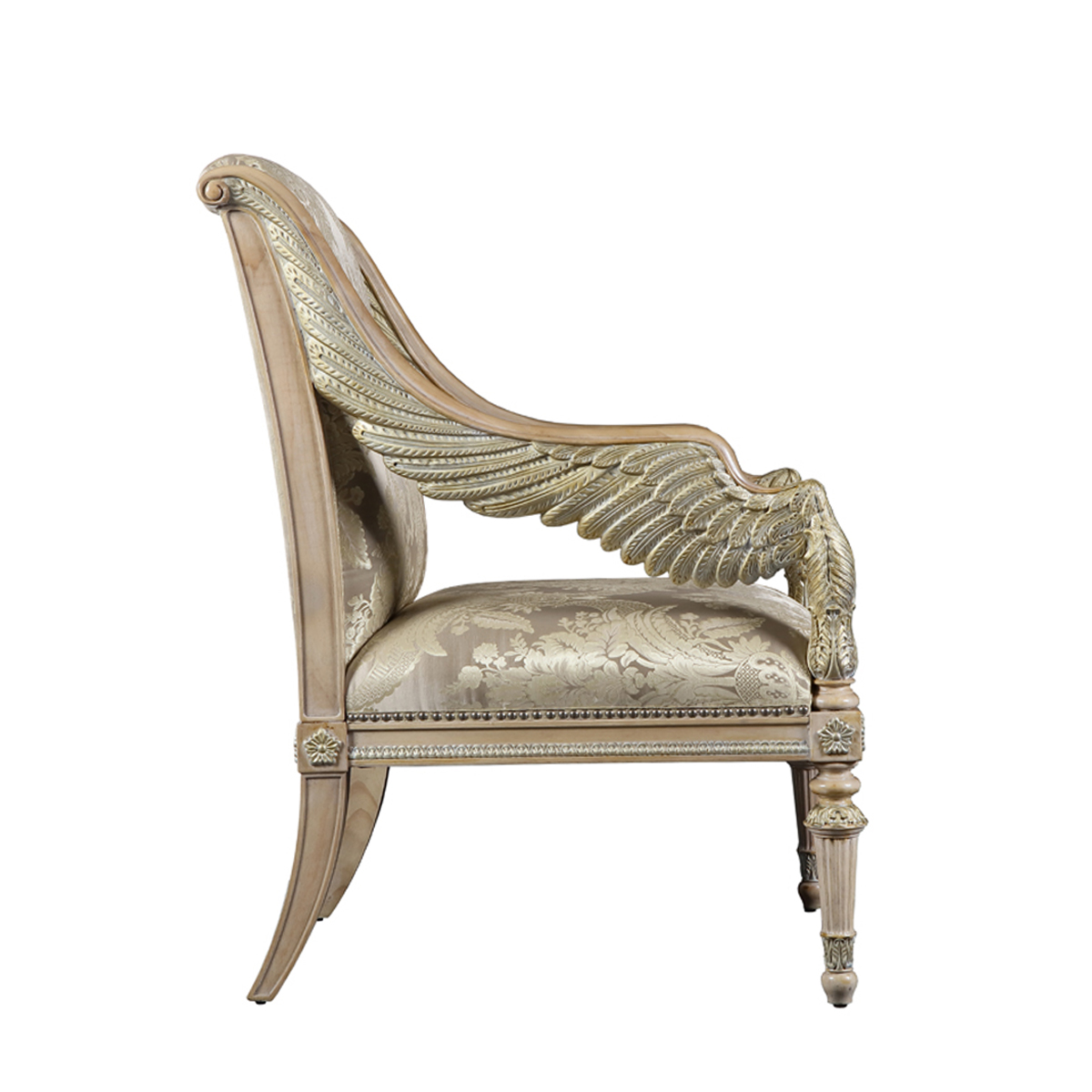 以現保存在法國"盧浮宮"的 “勝利女神像”為意念,并結合意大利強調帝權象征的帝國EMPIRE風格元素中翅膀造型,設計雕刻出勝利女神-Samothrace翅膀扶手,羽翼豐滿的羽毛雕刻極為精巧經典,栩栩如生,復興你的典雅情懷。