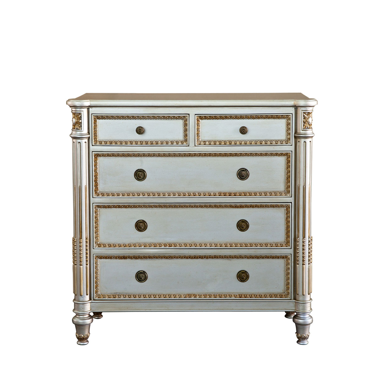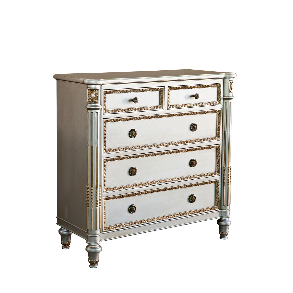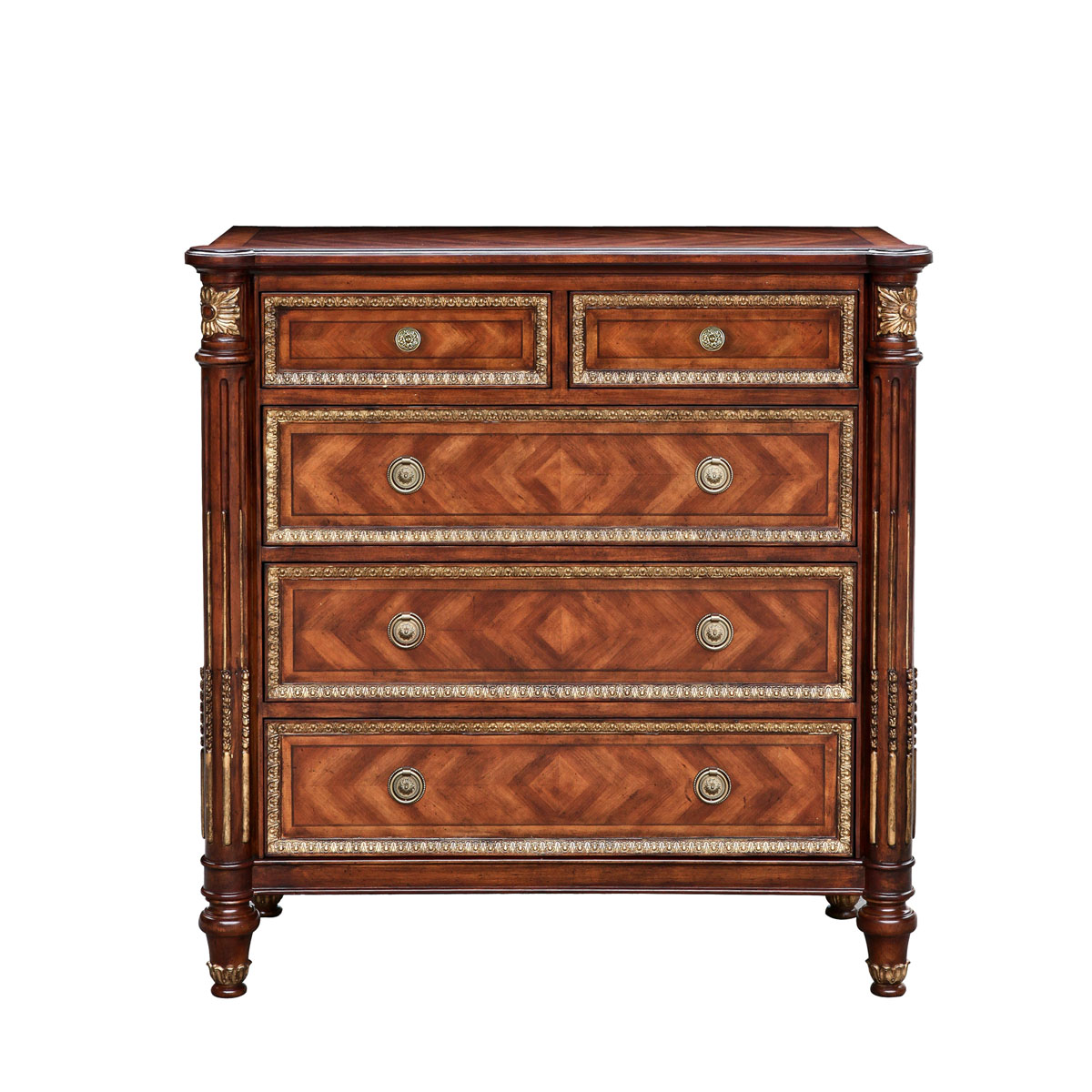 * 為表現(xiàn)法國(guó)路易時(shí)期的莊嚴(yán)和浪漫,以法國(guó)凡爾賽宮為設(shè)計(jì)元素。使用歌頌路易十四時(shí)期的太陽花雕刻;路易十六時(shí)期的建筑柱雕刻;顯示其王權(quán)穩(wěn)固地位的錐形腿腳設(shè)計(jì)、古銅色的球形把手和貼金工藝,完美演繹了法式宮廷家具的奢華尊貴。