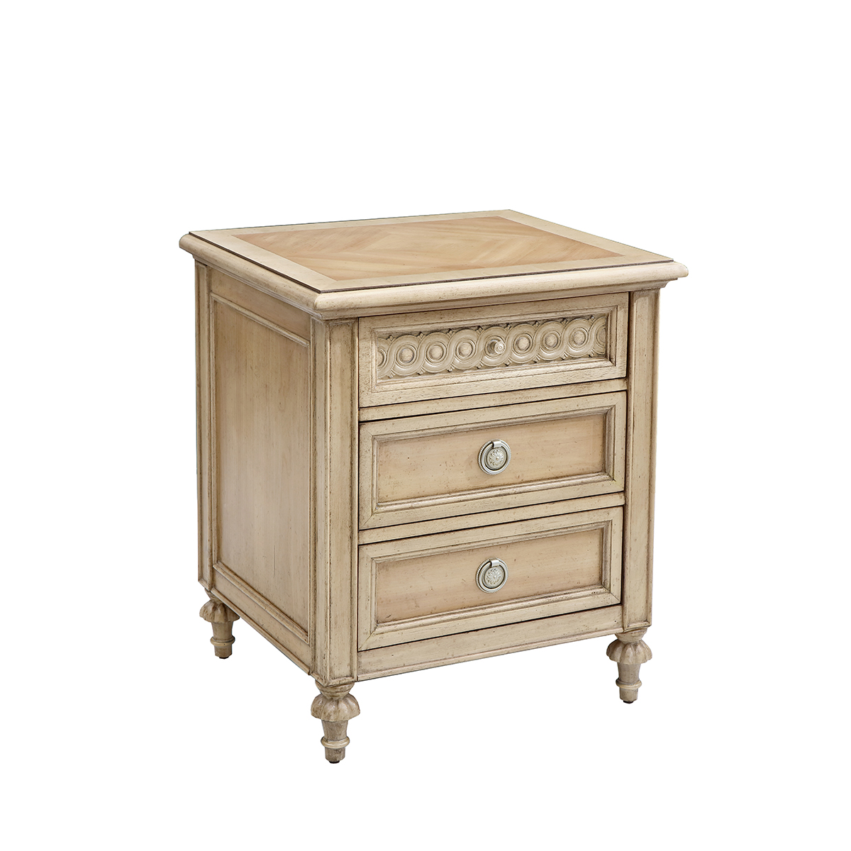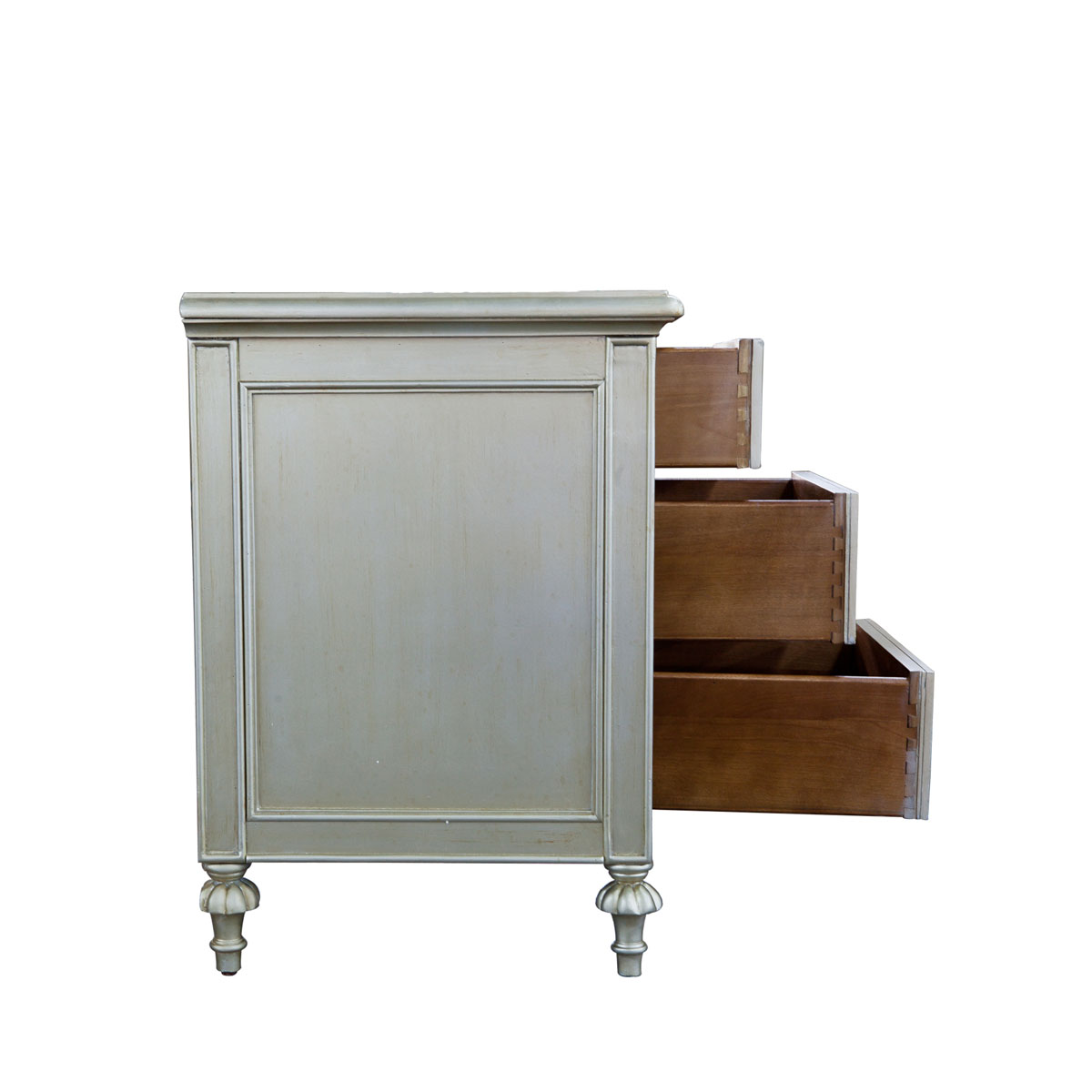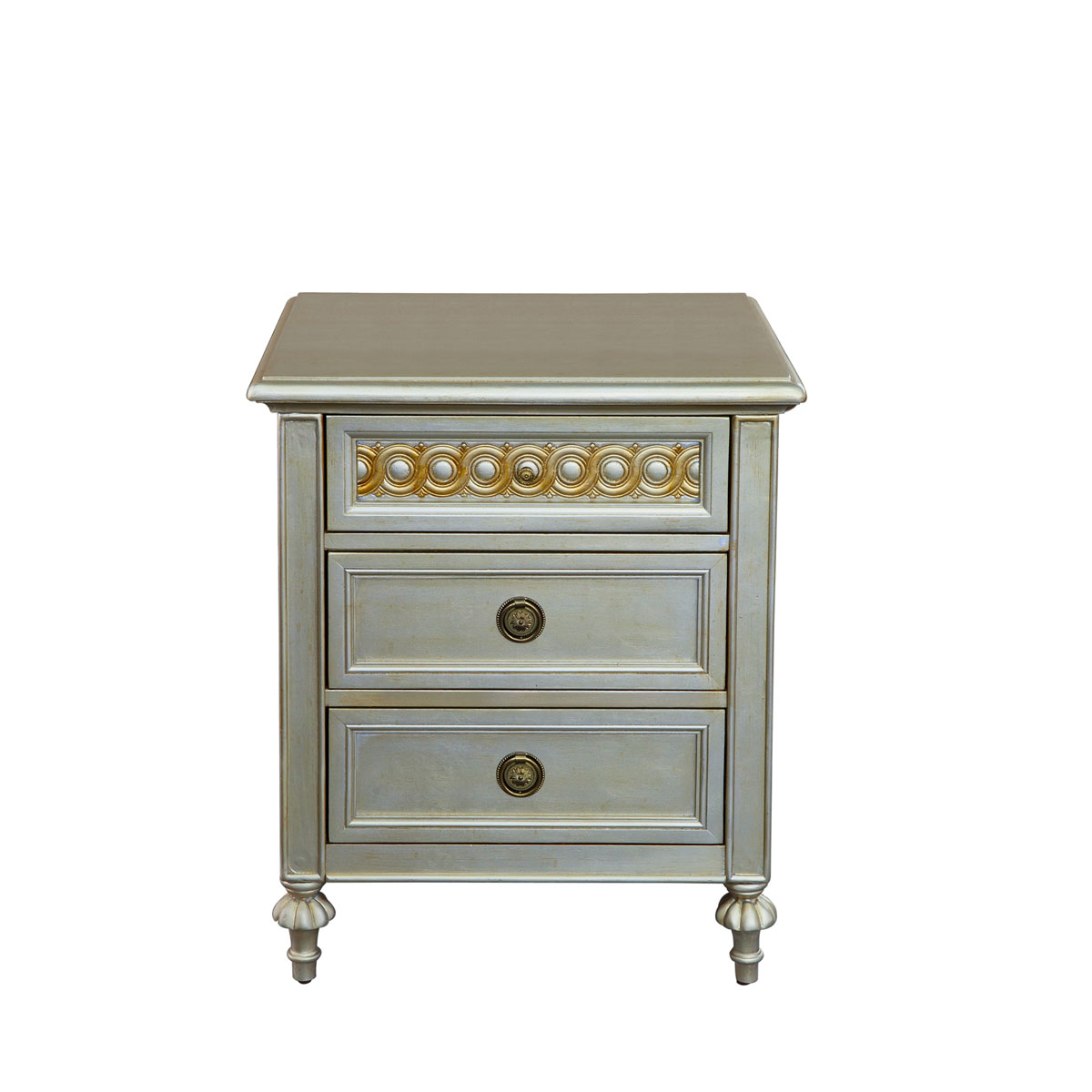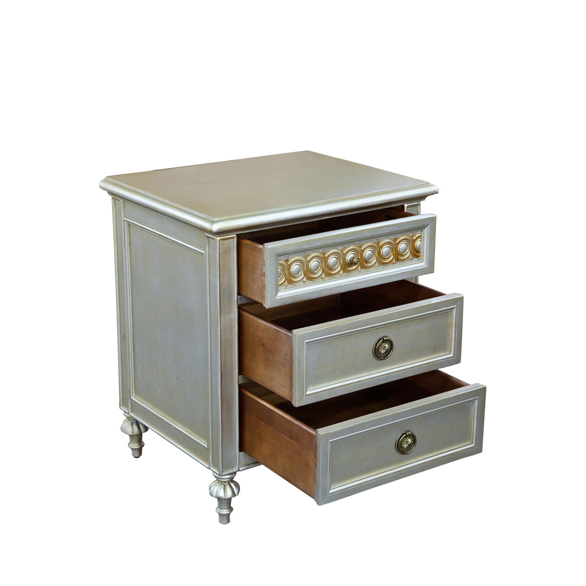 * 為表現(xiàn)法國路易時期的莊嚴(yán)和浪漫,以法國凡爾賽宮為設(shè)計元素。使用歌頌路易十四時期的太陽花連環(huán)雕刻,配以優(yōu)雅的花形腿腳設(shè)計、古銅色的球形把手和貼金工藝,完美演繹了法式宮廷家具的奢華尊貴。