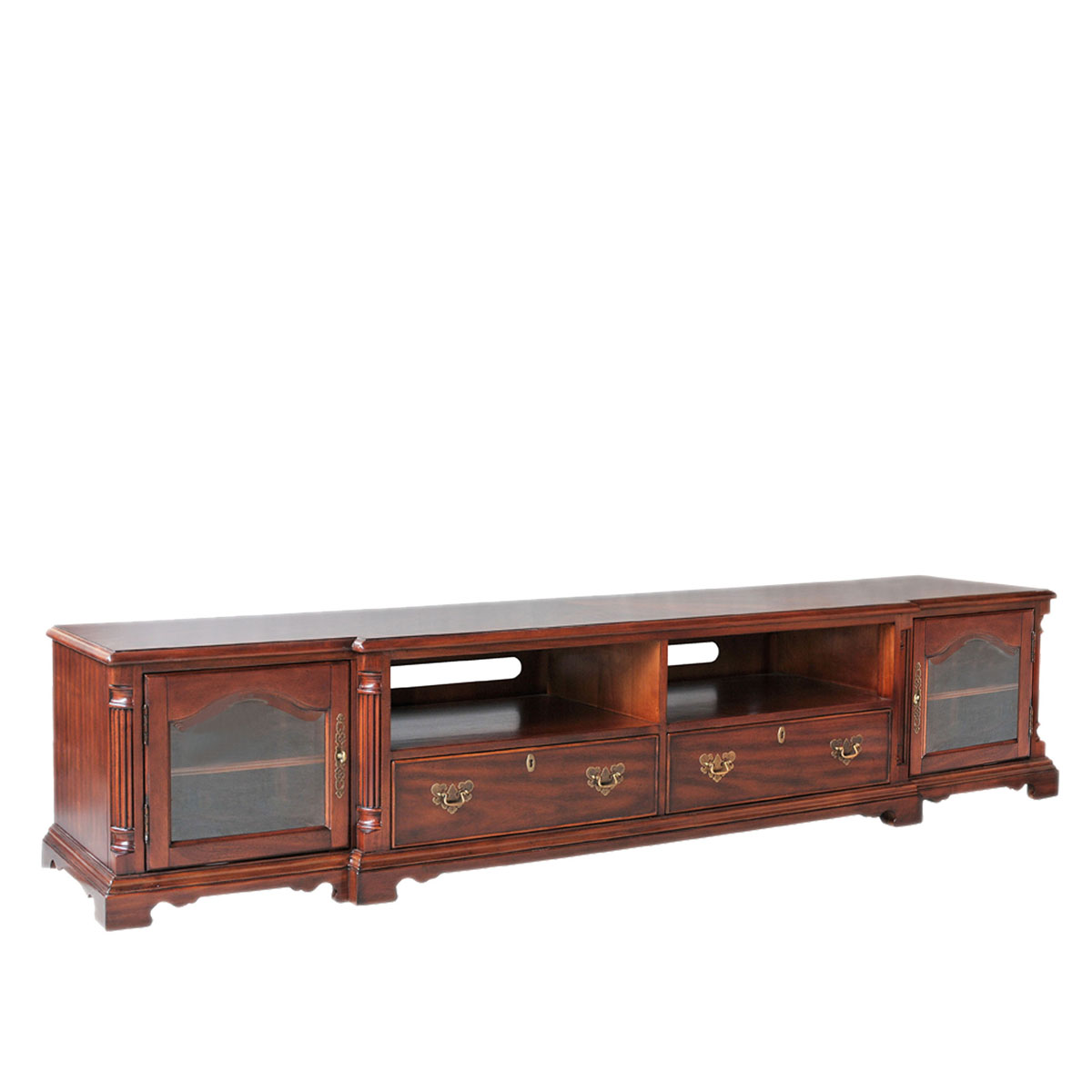 * 中間兩個儲物抽斗配有CD/DVD隔板,可CD/DVD更好的存放,其底部采用經典硬木實木滑軌設計; * 兩扇實木玻璃門內各有一塊可調層板; * 上部為開空設計,可在內放播放器等電子器材; * 腳部裝有可調腳釘;