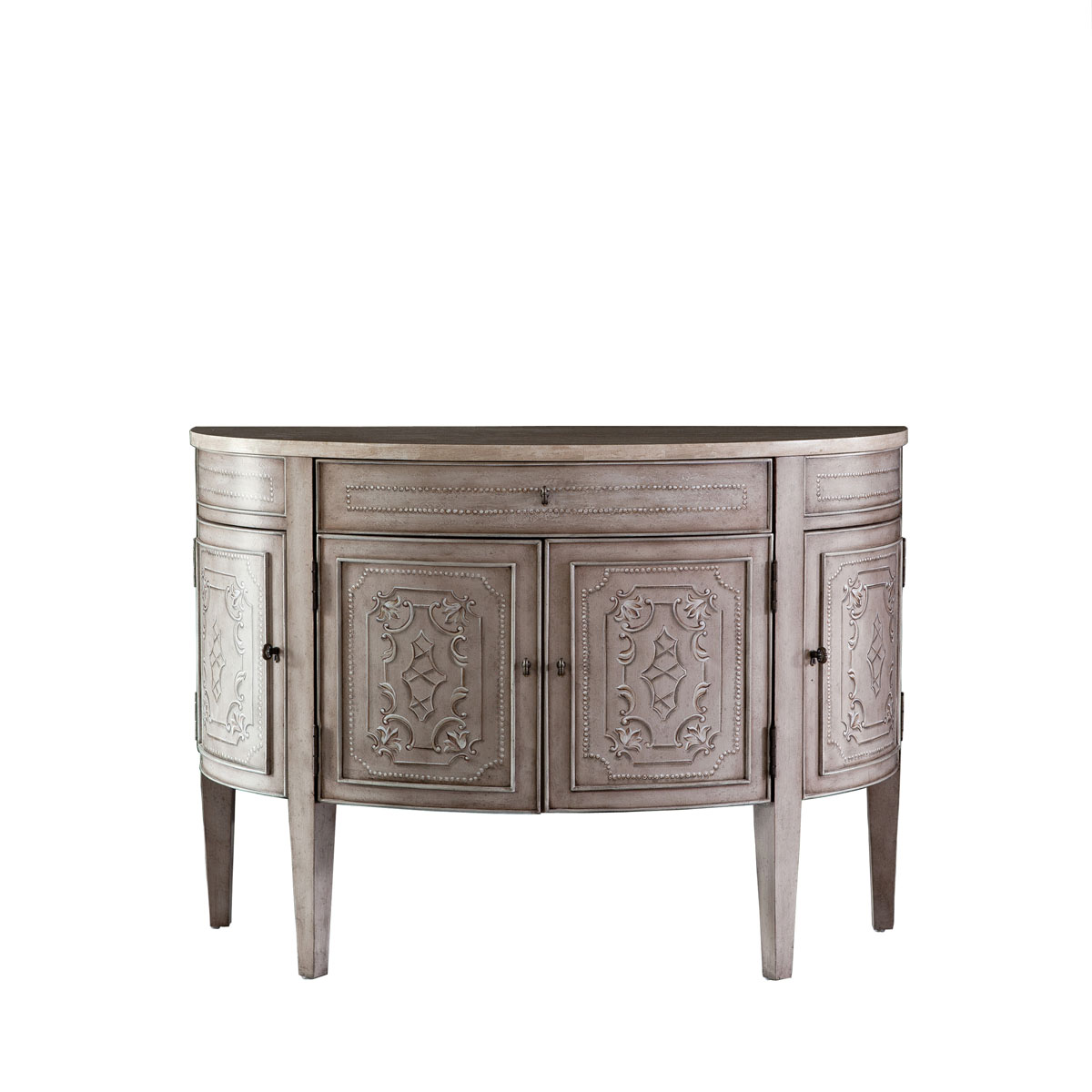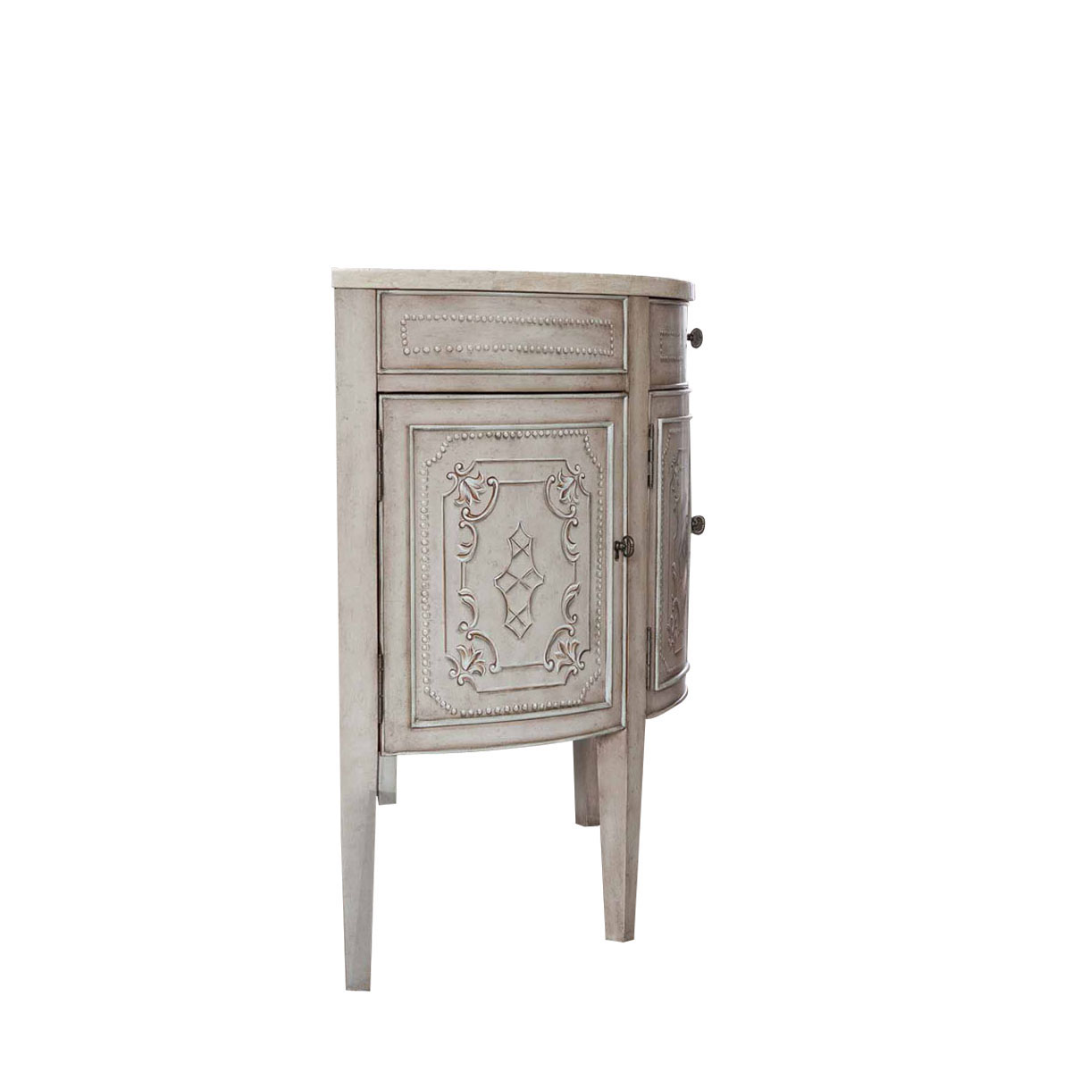 * 高貴的古銀色為這款半圓柜鍍上了一層永不過(guò)時(shí)的經(jīng)典外衣,開(kāi)裂紋、明暗不一的色澤等做舊工藝留住了歲月的印跡,洋溢著古董家具的藝術(shù)風(fēng)骨;簡(jiǎn)潔優(yōu)雅的雕刻圖案,蘊(yùn)藉著耐人尋味的美學(xué)內(nèi)涵,如若傳之后世更顯光彩榮耀。