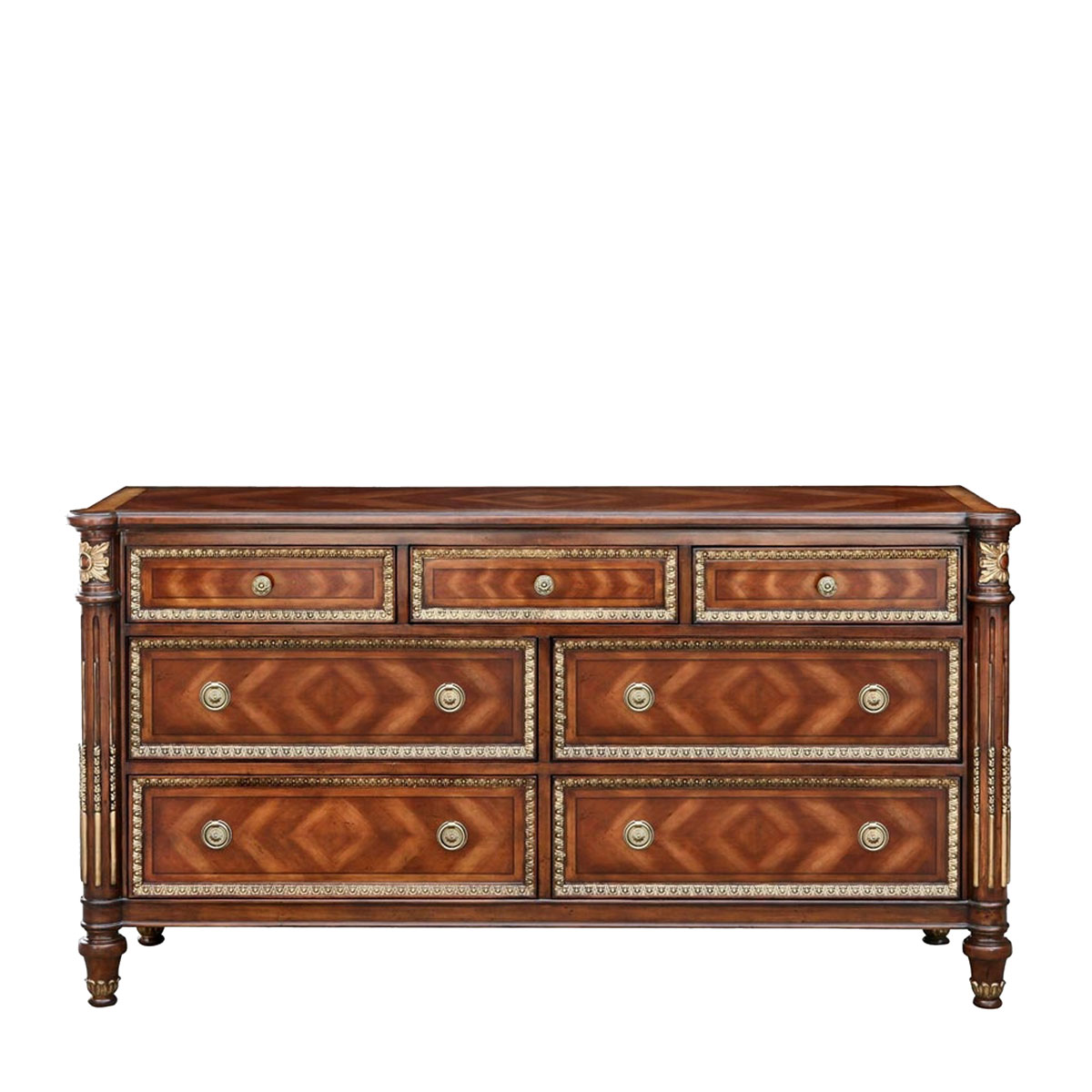 * 為表現法國路易時期的莊嚴和浪漫,以法國凡爾賽宮為設計元素。使用歌頌路易十四時期的太陽花雕刻,顯示其王權穩固地位的錐形腿腳設計,配以鉆石圖案的木皮貼面、古銅色的球形把手和貼金工藝,完美演繹了法式宮廷家具的奢華尊貴。