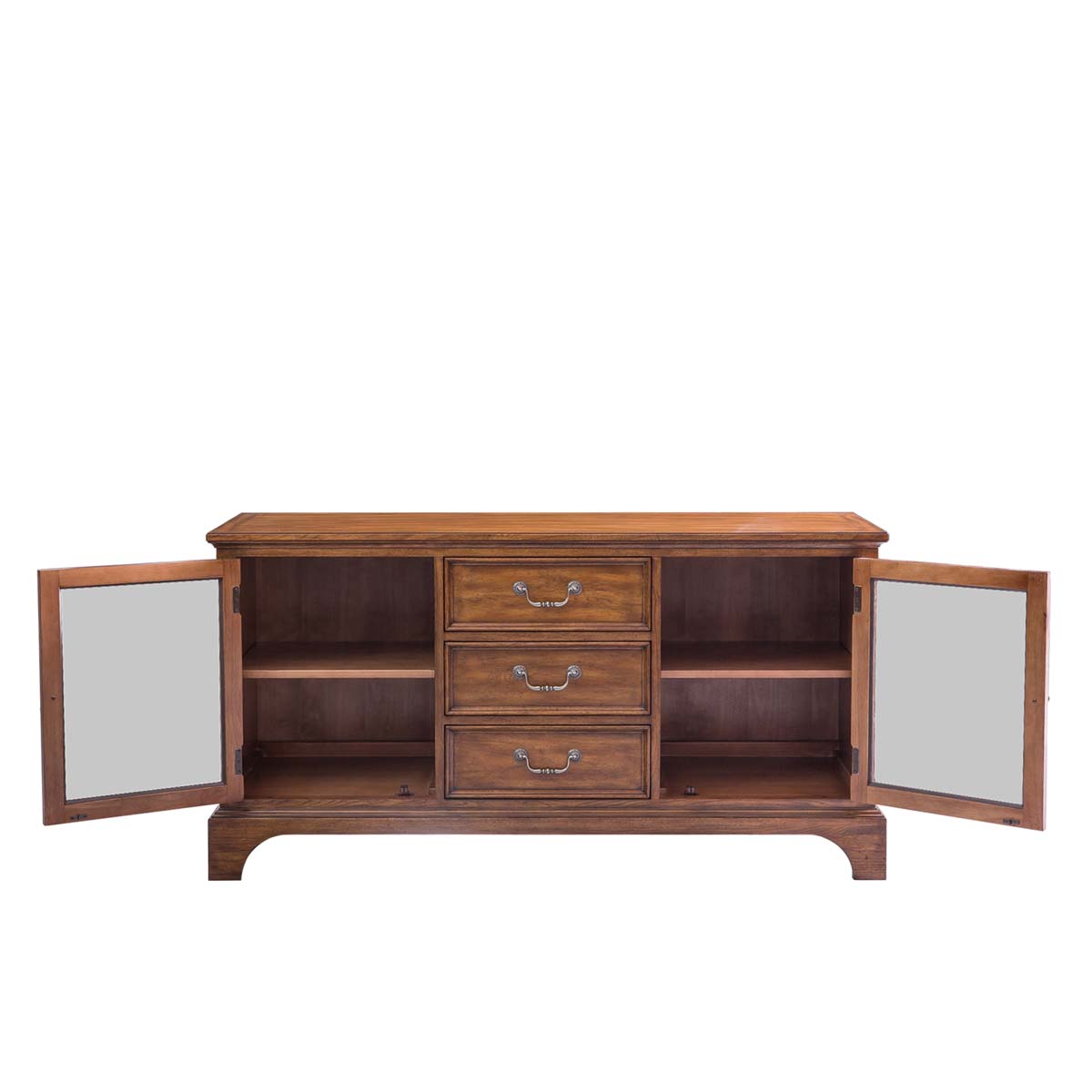 * 3個儲物抽斗,采用硬木實木滑軌設計; * 兩邊實木框玻璃門,門內各帶一塊木制活動層板 * 腳底部裝有可調整的腳釘;