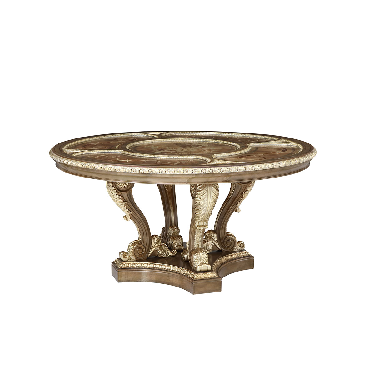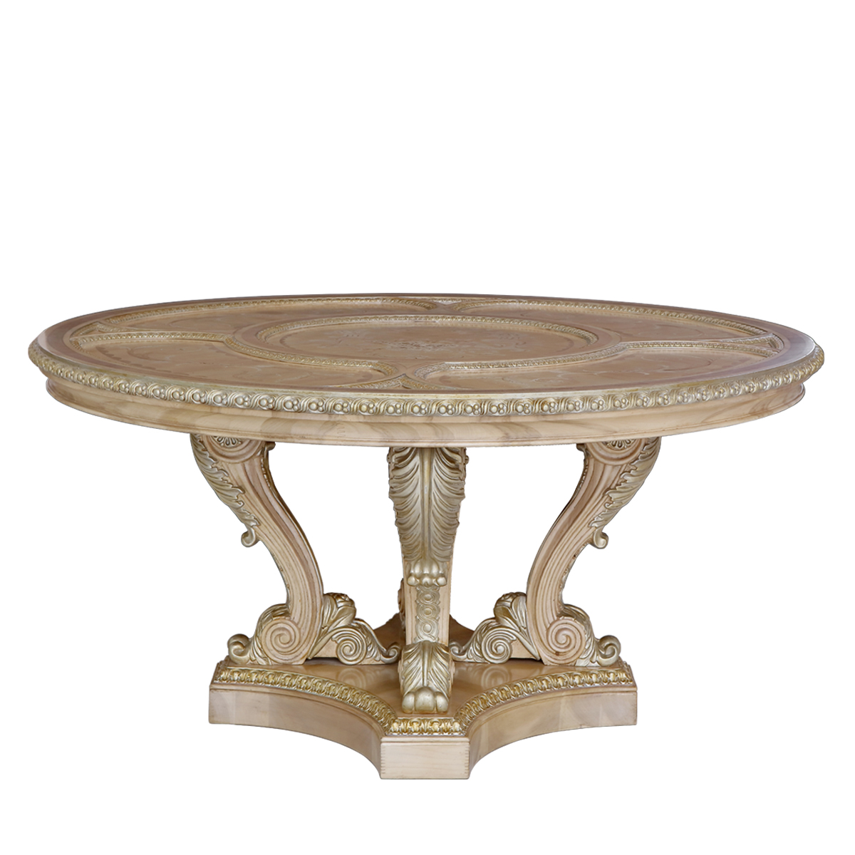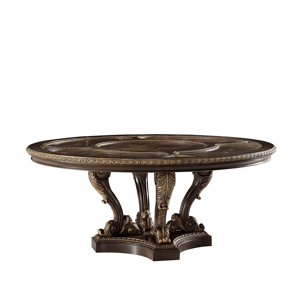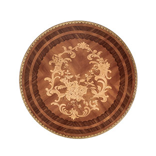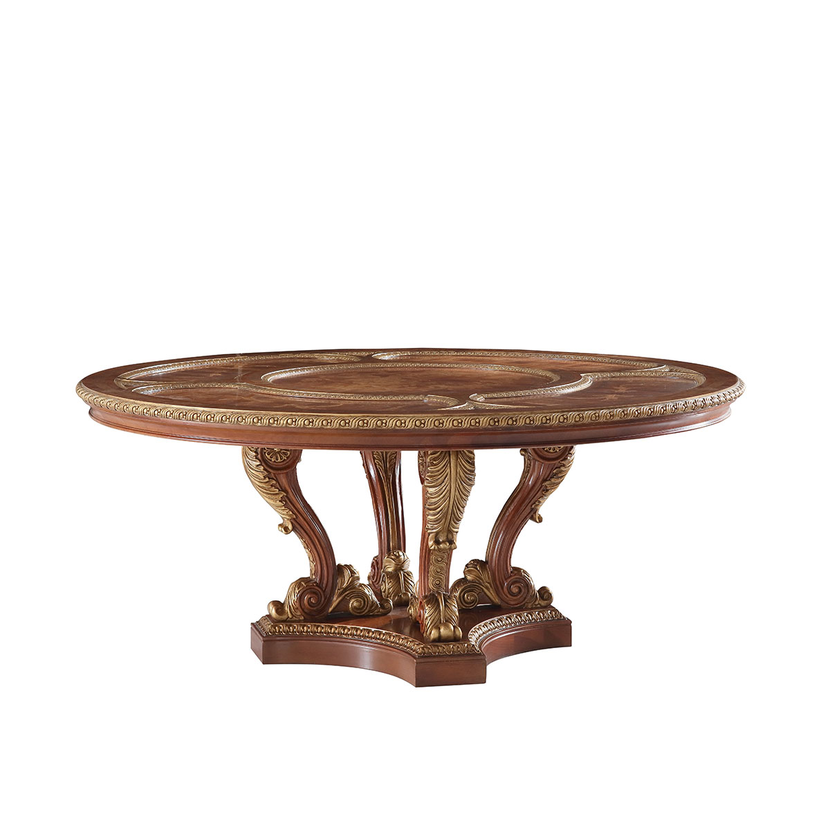 凡爾賽玫瑰圓餐臺傳遞濃郁的宮廷藝術(shù)氣息,象征勝利與榮譽(yù)的阿波羅月桂葉和花朵雕刻覆蓋桌腳,經(jīng)典的獸腳設(shè)計體現(xiàn)皇室家具的權(quán)威。桌面珍稀木皮拼花紋理清晰如同花草朵朵綻放,用餐之際仿佛都能聞到陣陣花香。