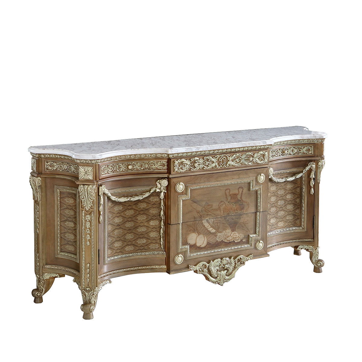 以法國著名工匠 Jean Henri Riesener 為 Louis VXI (路易十六)設(shè)計的新古典風(fēng)格古董櫃為靈感,四平八穩(wěn)的方形設(shè)計配以細(xì)膩的雕刻與實木簿片鑲嵌,呈現(xiàn)出法國宮廷的浪漫。