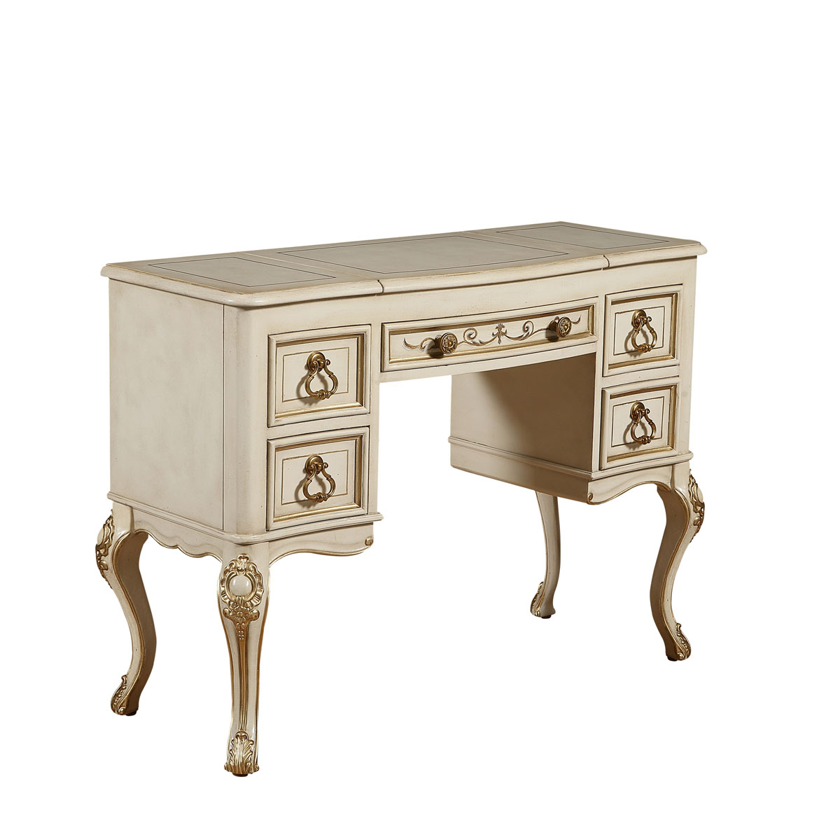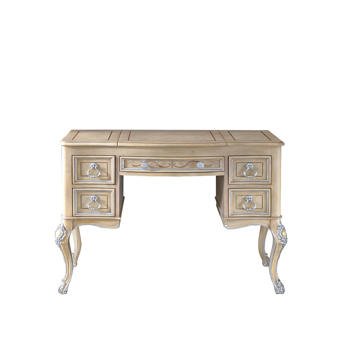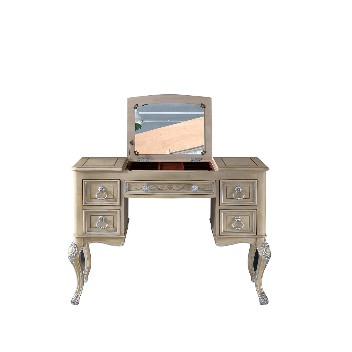 * 四個儲物抽斗,底部采用硬木實木滑軌.中間抽斗的設計可翻下斗面,用來放置鍵盤,抽斗內(nèi)側(cè)有電線孔,抽斗兩邊裝有兩條三節(jié)消聲鐵滑軌,滑順耐用; * 中間面板可打開,里面有鏡子和絨布戒指格; * 腳底部裝有可調(diào)腳釘
