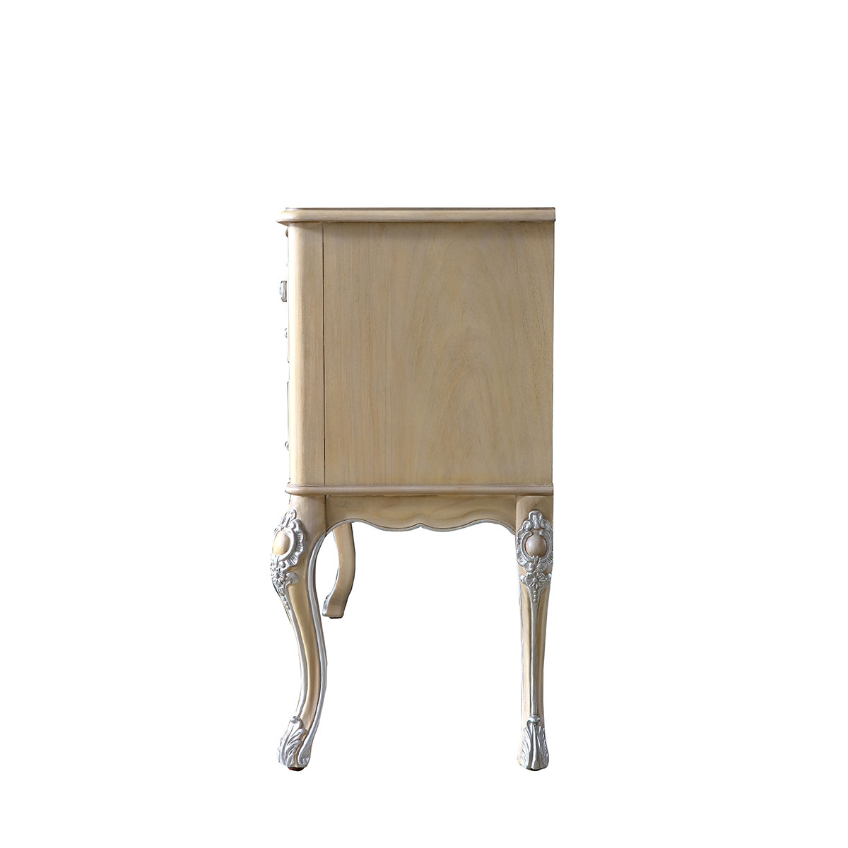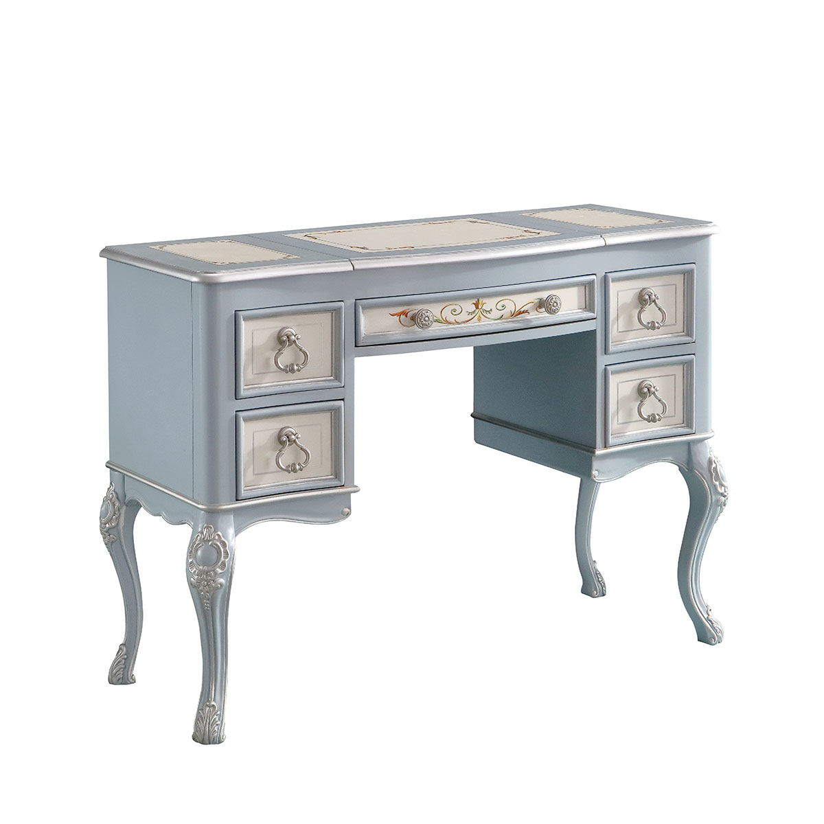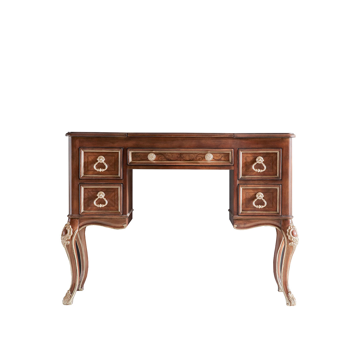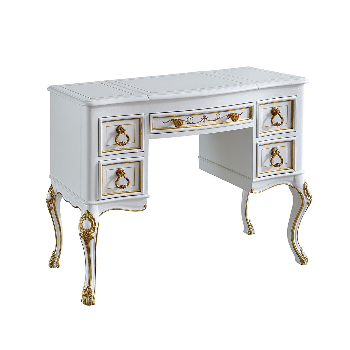 * 四個儲物抽斗,底部采用硬木實木滑軌.中間抽斗的設計可翻下斗面,用來放置鍵盤,抽斗內(nèi)側(cè)有電線孔,抽斗兩邊裝有兩條三節(jié)消聲鐵滑軌,滑順耐用; * 中間面板可打開,里面有鏡子和絨布戒指格; * 腳底部裝有可調(diào)腳釘