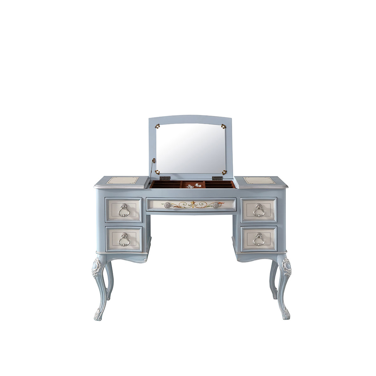 * 四個儲物抽斗,底部采用硬木實木滑軌.中間抽斗的設計可翻下斗面,用來放置鍵盤,抽斗內側有電線孔,抽斗兩邊裝有兩條三節(jié)消聲鐵滑軌,滑順耐用; * 中間面板可打開,里面有鏡子和絨布戒指格; * 腳底部裝有可調腳釘