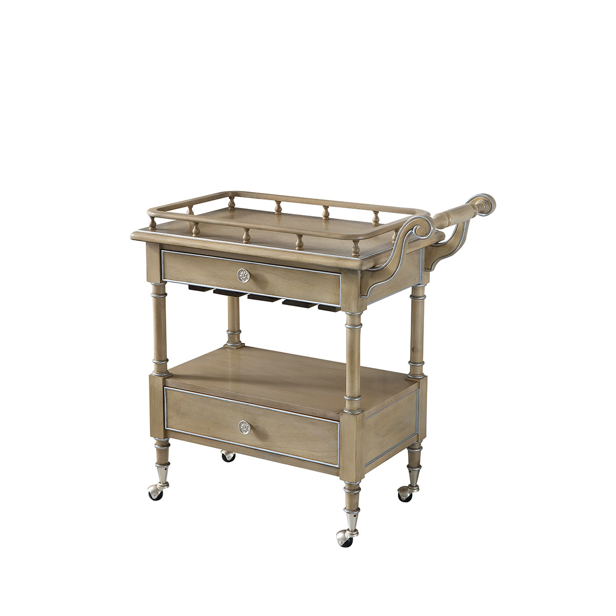 * 二個儲物抽斗,底部采用經典的硬木實木滑軌 * 頂上有護邊帶推手,底下帶腳輪,中間帶掛酒杯的木制瓶架。