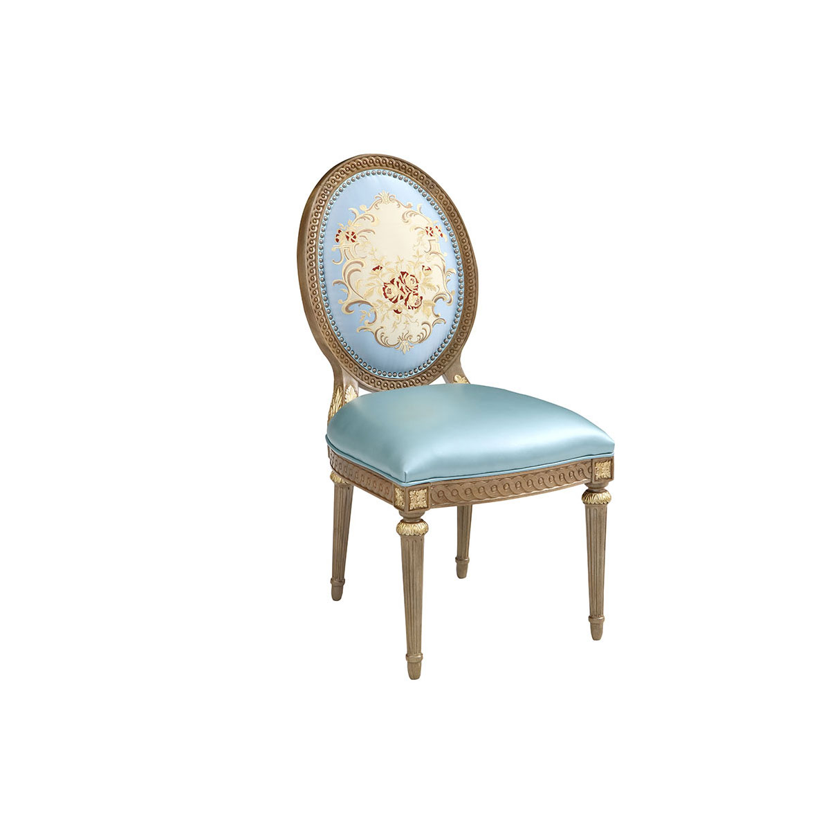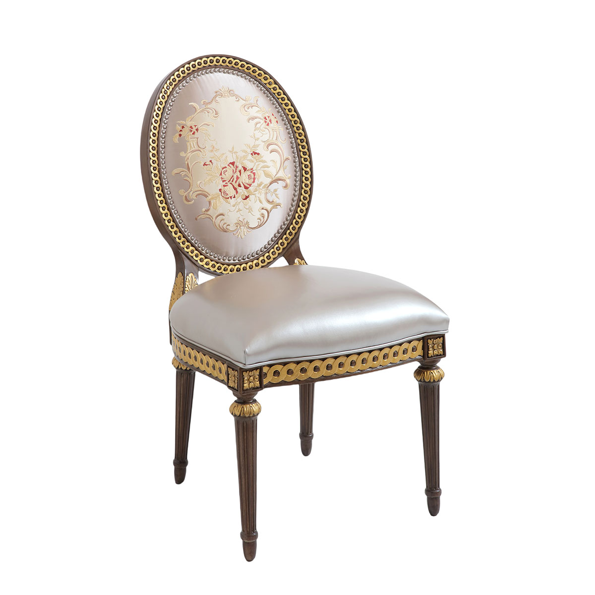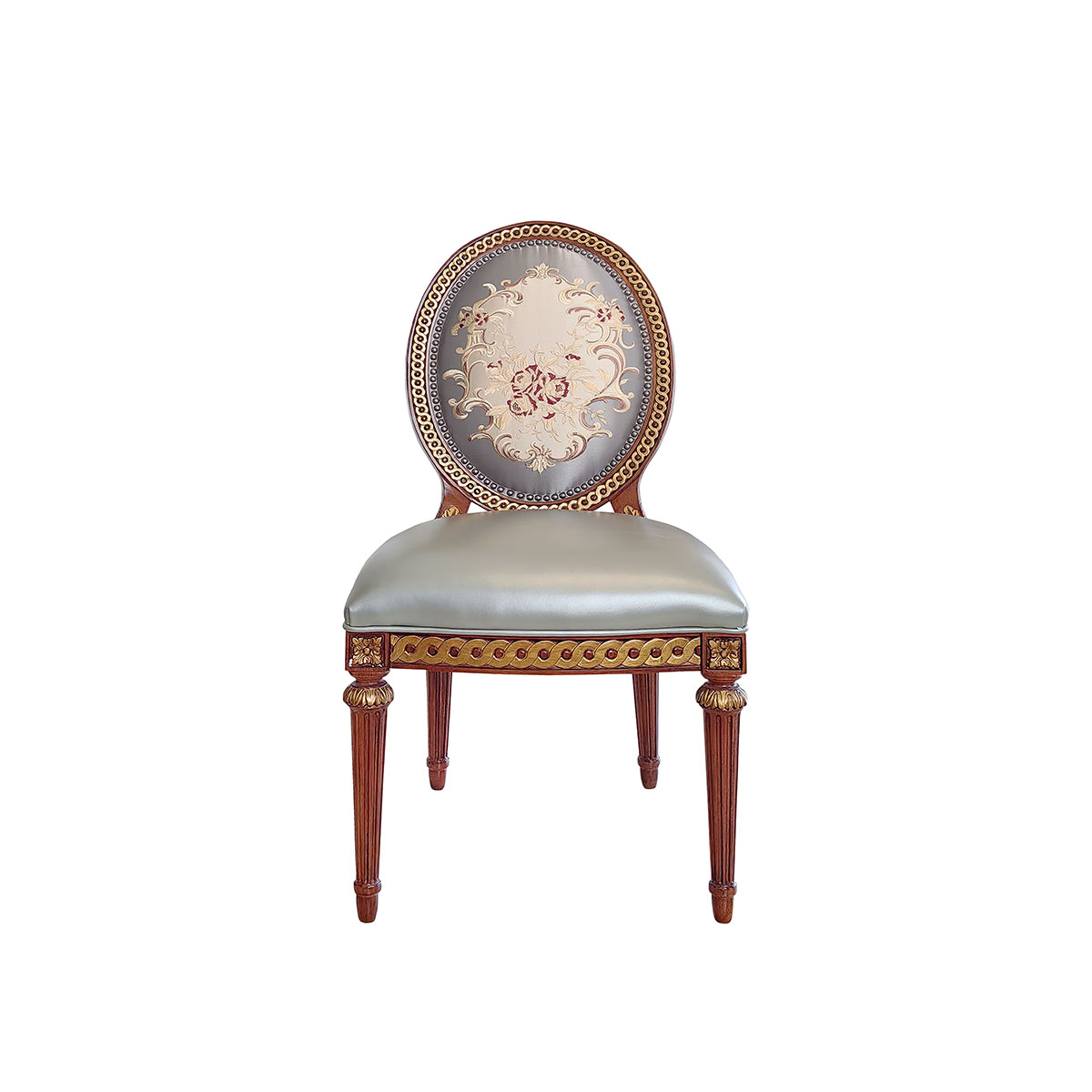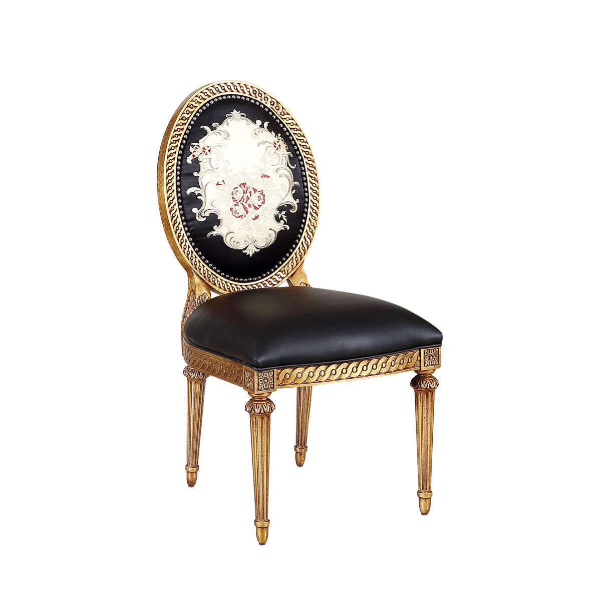 參考18世紀法國路易十六時期涂金扶手椅古董設計,并結合同時期的圓面背板設計。配上精致的連續(xù)雕刻和貼金鉑工藝、錐形腳設計、觸感舒適的布藝和包有豐厚的填充物坐墊和靠背。