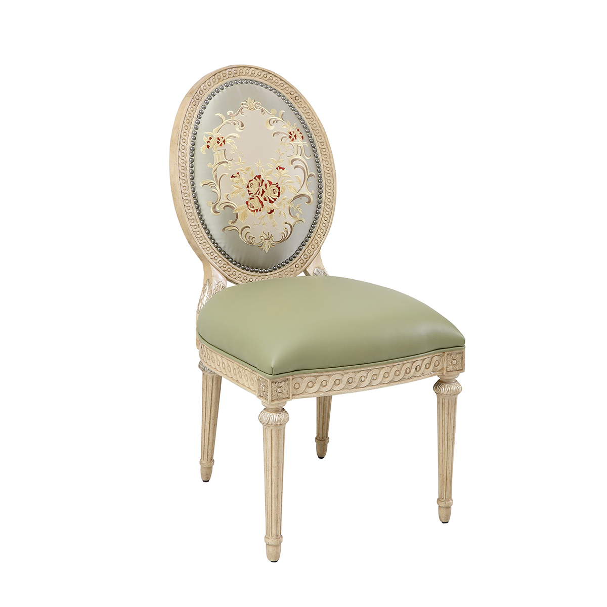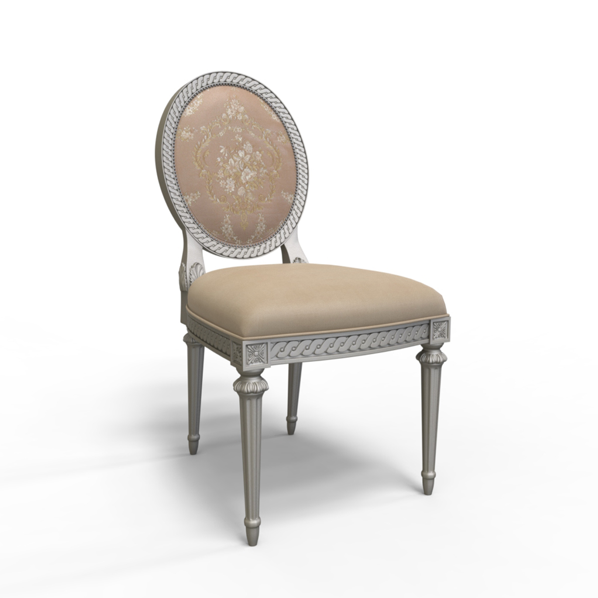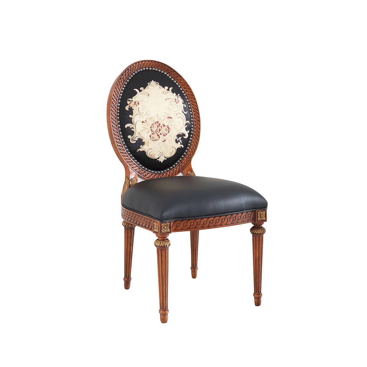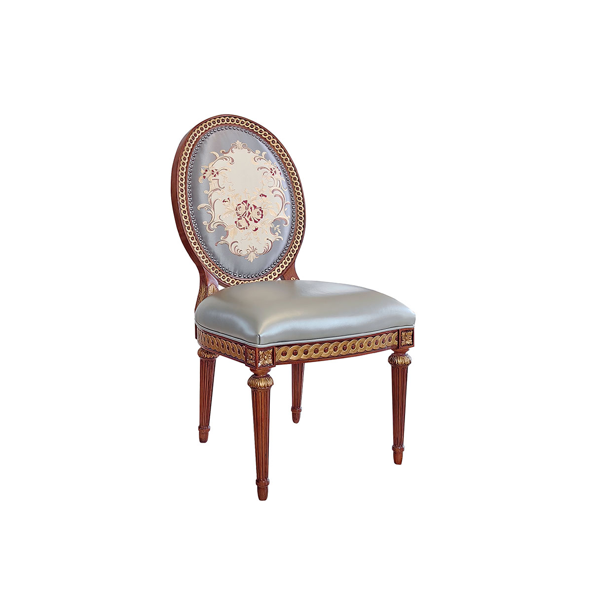 參考18世紀法國路易十六時期涂金扶手椅古董設計,并結合同時期的圓面背板設計。配上精致的連續(xù)雕刻和貼金鉑工藝、錐形腳設計、觸感舒適的布藝和包有豐厚的填充物坐墊和靠背。