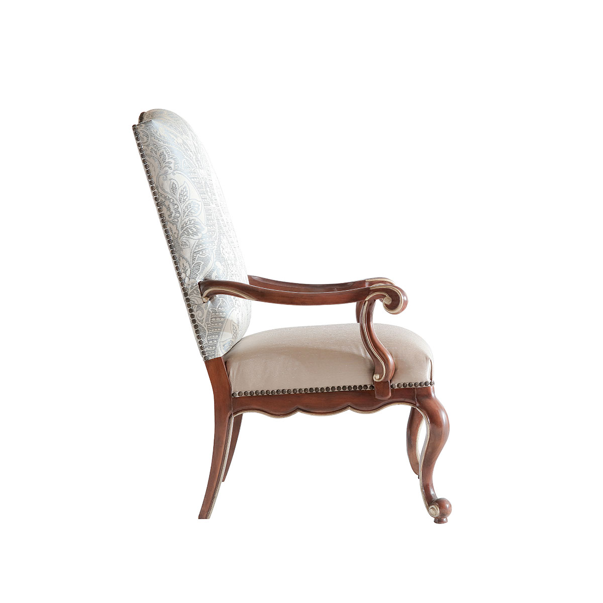 一款集合法式元素包括Camelback Silhouette(駝峰輪廓)造型、旋渦形扶手和S形彎腳的高背休閑椅,并配上觸感舒適的布藝和包有豐厚的填充物坐墊和靠背。