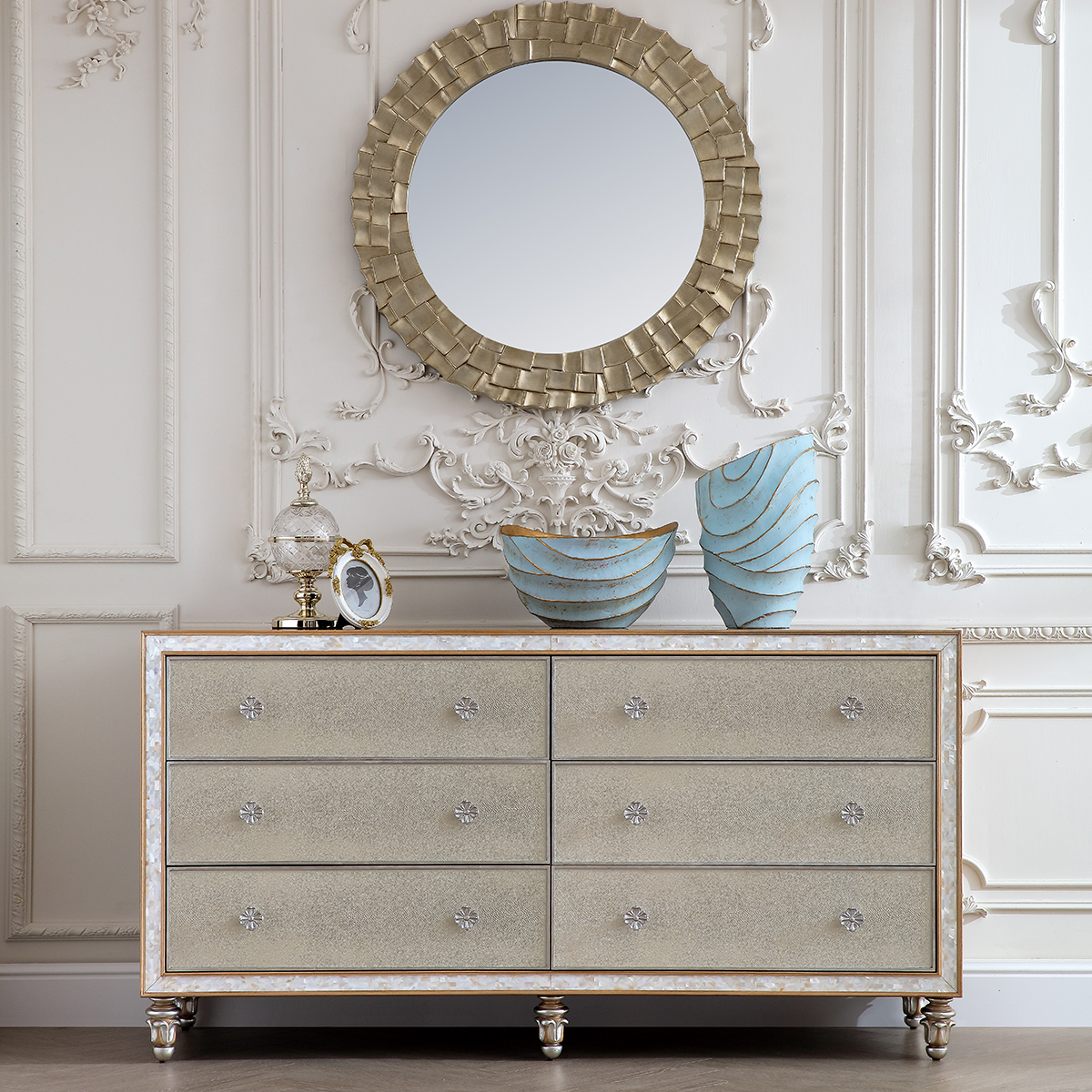 橡膠木+環(huán)保人造板+貝殼+黑胡桃+艷陽花+櫻桃木等木皮貼面+皮革