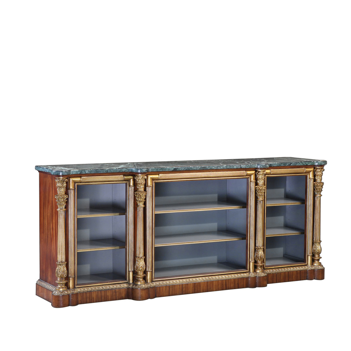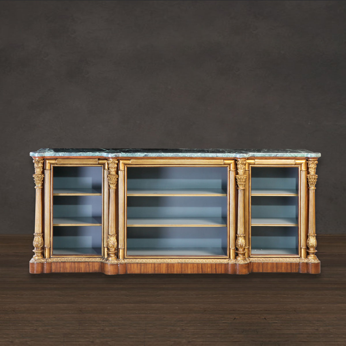 * 這是設(shè)計意念來自于英國溫莎堡中喬治三世時期的走廊柜。臺面采用云石做裝飾,借以表達(dá)喬治三世王權(quán)的堅不可摧。使用以華麗莊嚴(yán)的 Corinthian Order(科林斯式羅馬柱)為原型的雕刻柱,配上細(xì)膩的木皮貼面和貼金箔工藝,充分展現(xiàn)了英式古董家具的絕世芳華。