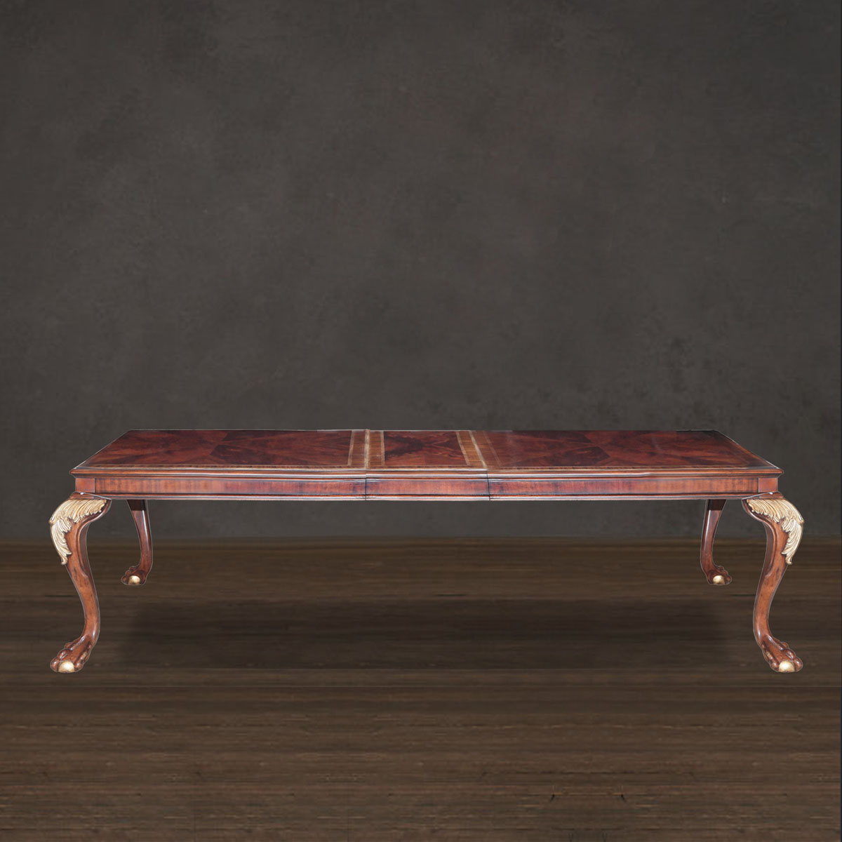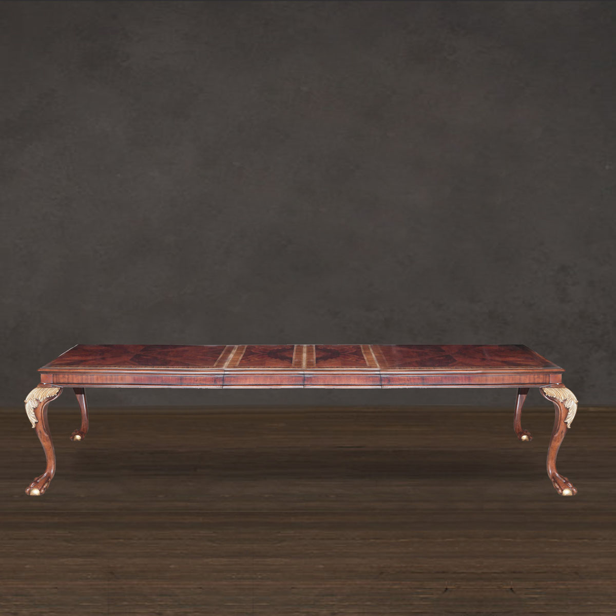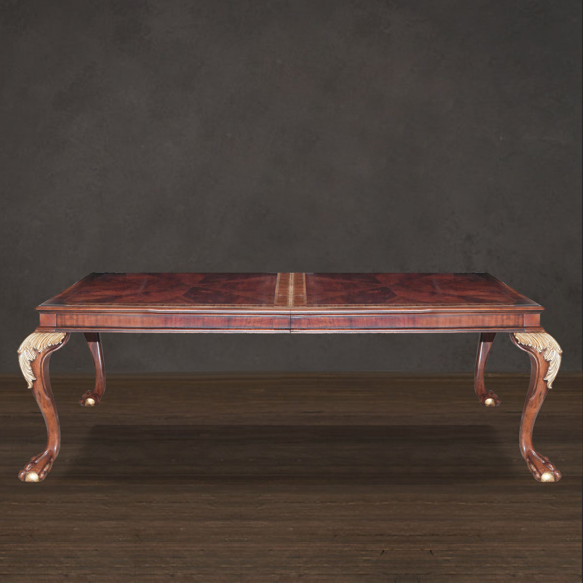* 為表現英國皇室的華麗和莊嚴,以英國溫莎堡為設計元素。采用經典的 Chippendale(齊彭代爾式)獸抓球彎腿設計、卷葉雕刻和貼金工藝,配上可調節的伸板設計與精美的木皮貼面圖案,完美演繹了英式宮廷家具的奢華尊貴,可謂是極具典藏價值的傳世之作。