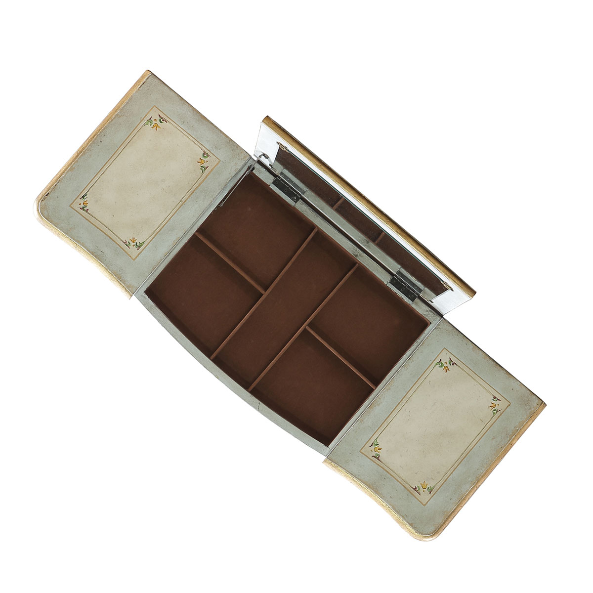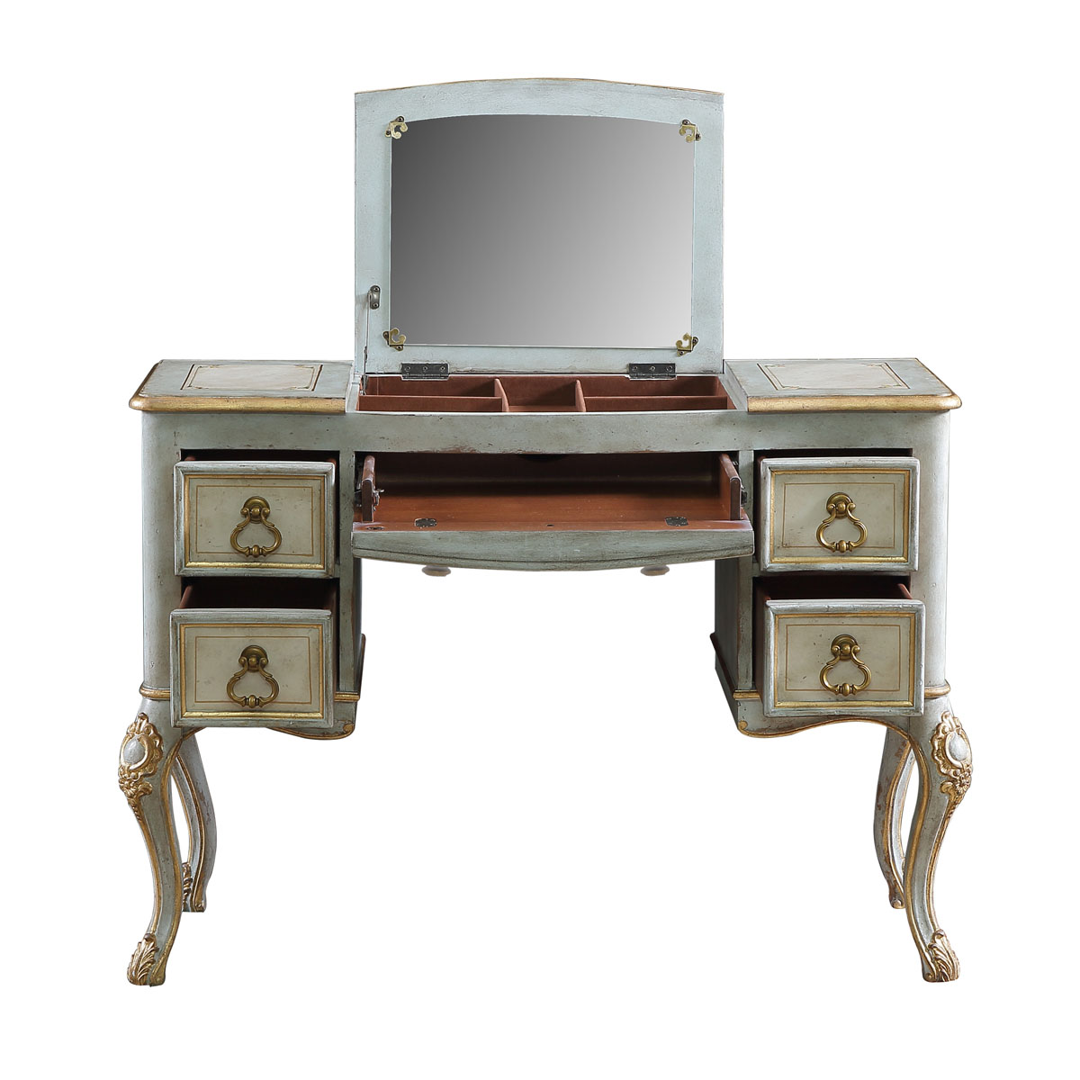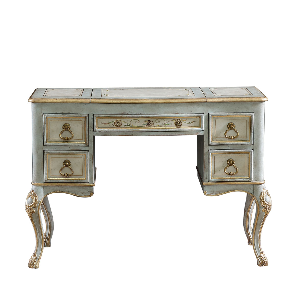 * 四個儲物抽斗,底部采用硬木實木滑軌.中間抽斗的設計可翻下斗面,用來放置鍵盤,抽斗內(nèi)側(cè)有電線孔,抽斗兩邊裝有兩條三節(jié)消聲鐵滑軌,滑順耐用; * 中間面板可打開,里面有鏡子和絨布戒指格; * 腳底部裝有可調(diào)腳釘