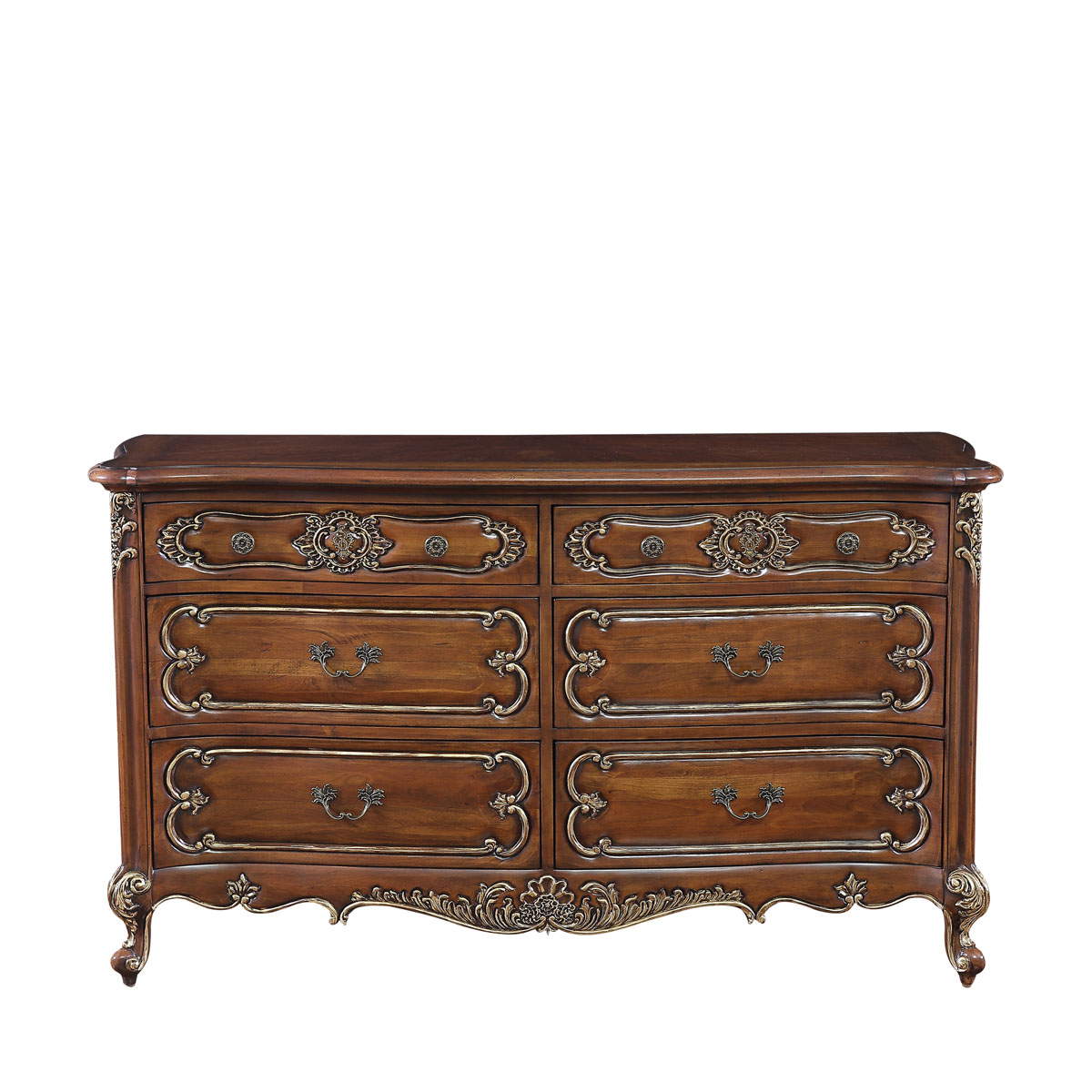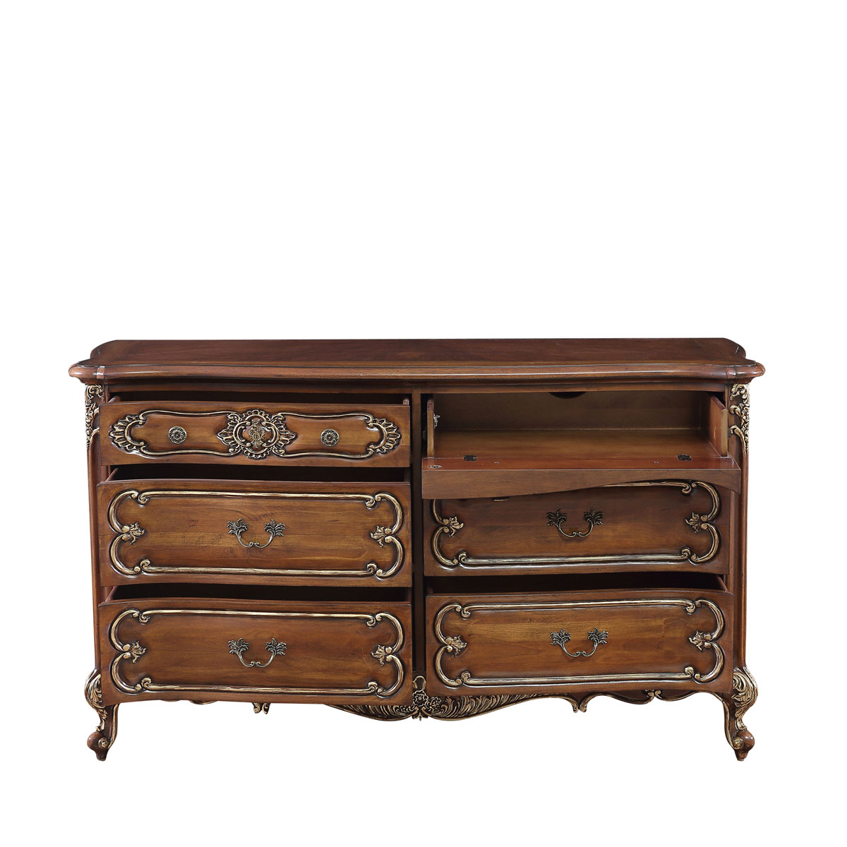 * 手工雕刻的花圃、藤蔓、阿坎瑟斯卷葉圖案和彎腳設計; * 結實的連接技術; * 6個儲物抽斗,右上斗為翻斗,內可置放電子器材,其底部采用經典硬木實木滑軌設計; * 腳底部裝有可調腳釘;