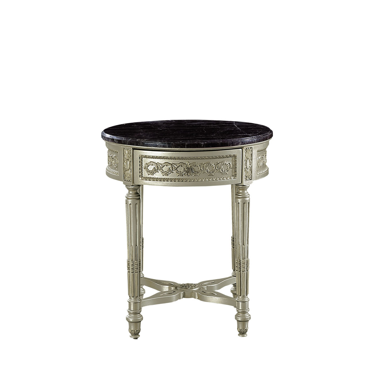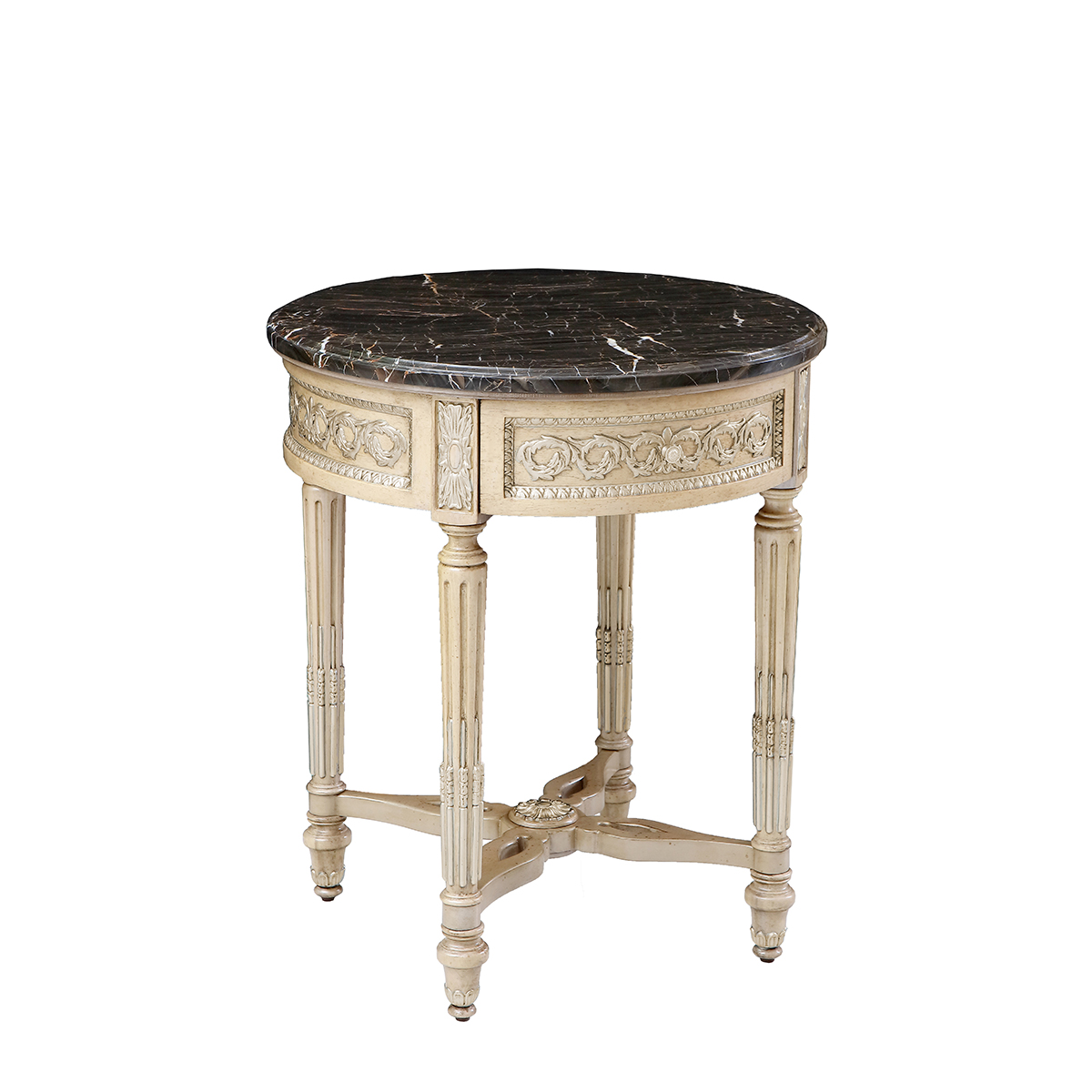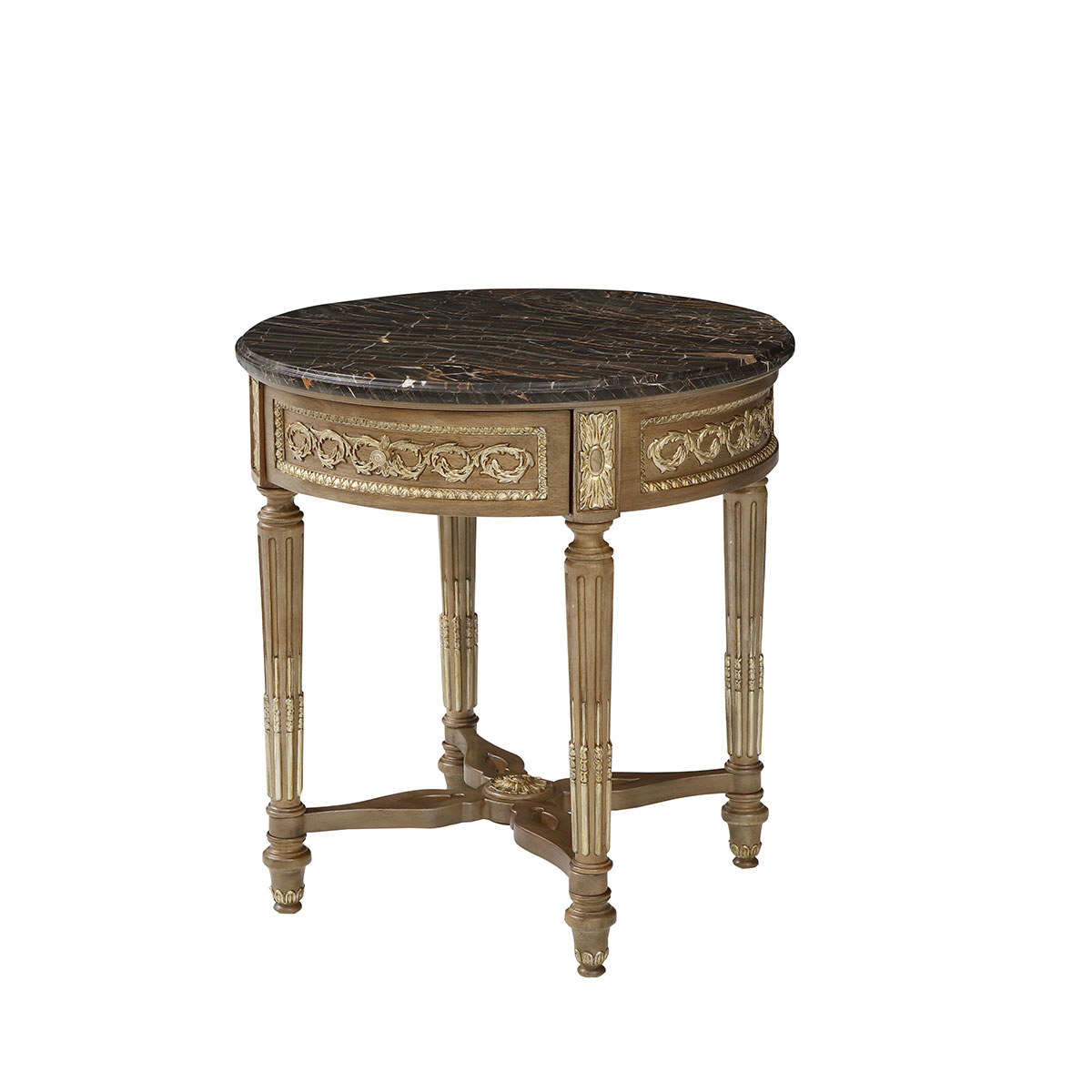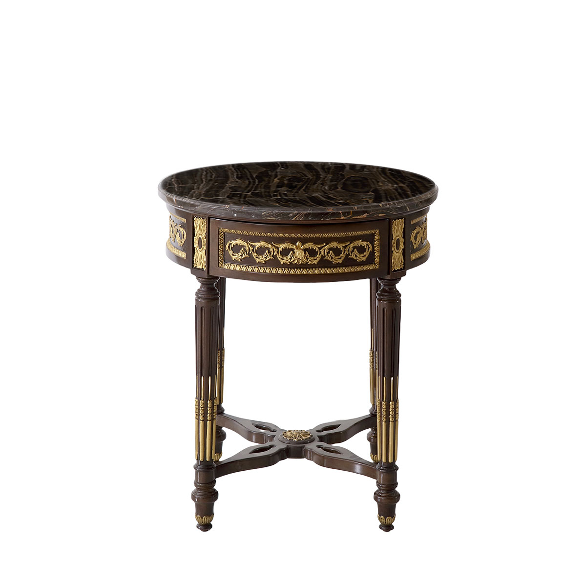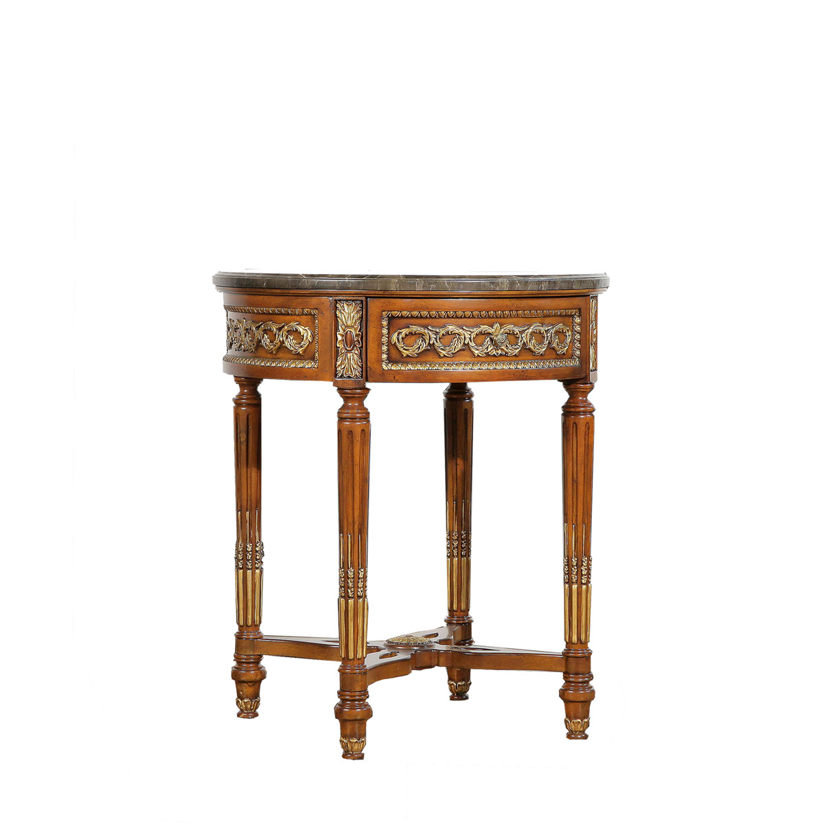 * 為表現(xiàn)法國路易時期的莊嚴和浪漫,以法國凡爾賽宮為設(shè)計元素。使用歌頌路易十四時期的太陽花連環(huán)雕刻,顯示其王權(quán)穩(wěn)固地位的錐形腿腳設(shè)計;配以哥特式建筑中的大圓窗骨架設(shè)計、珍稀大理石臺面、建筑柱雕刻與絢麗的貼金工藝,完美演繹了法式宮廷家具的奢華尊貴。