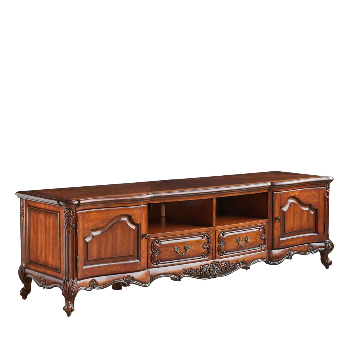 * 手工雕刻的花圃、藤蔓、阿坎瑟斯卷葉圖案和彎腳設計 * 結實的連接技術 * 兩個儲物抽斗并配有CD/DVD隔板,而在其底部采用經典硬木實木滑軌設計;門內配有可調層板