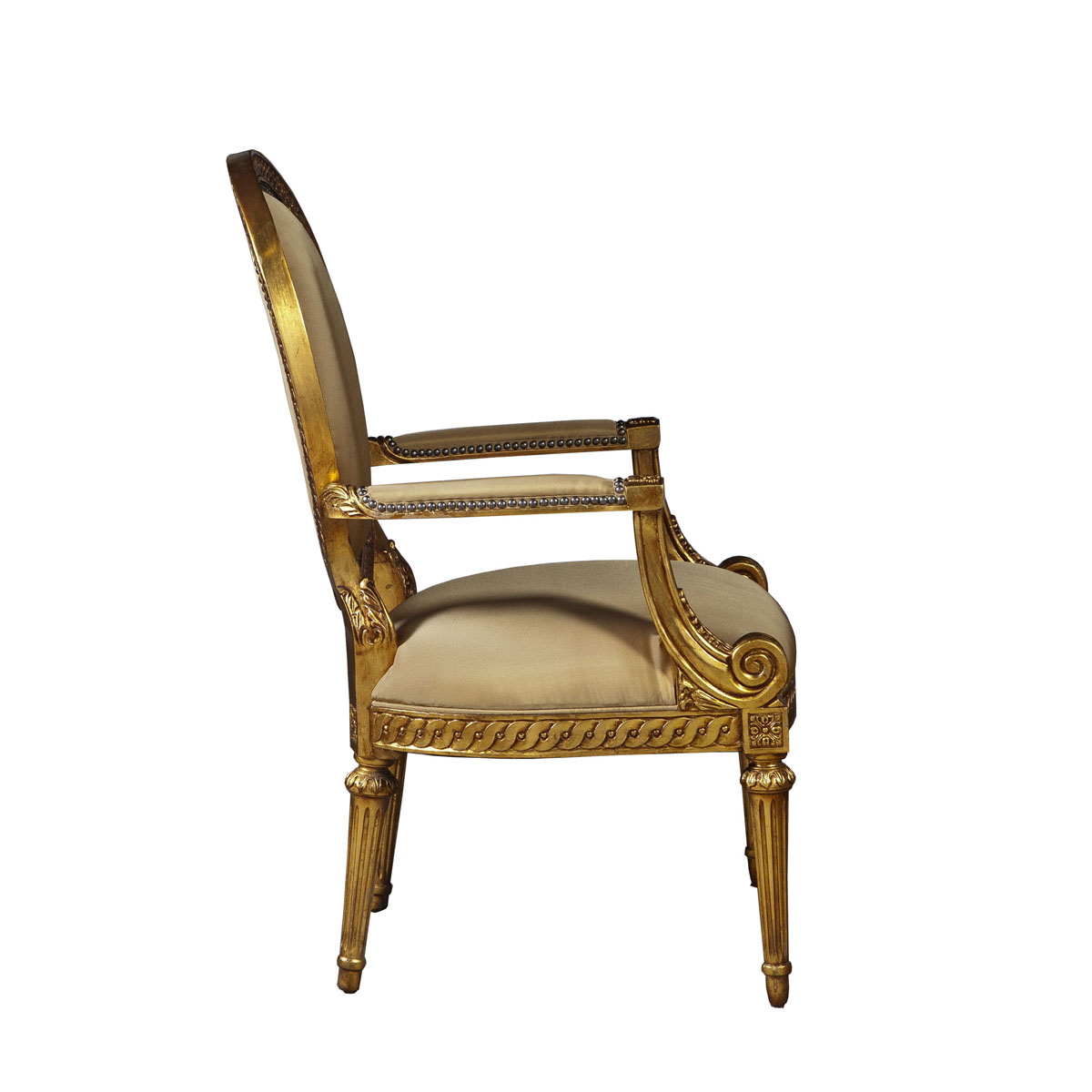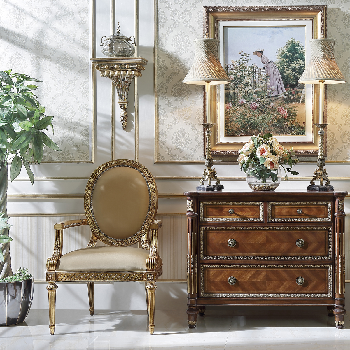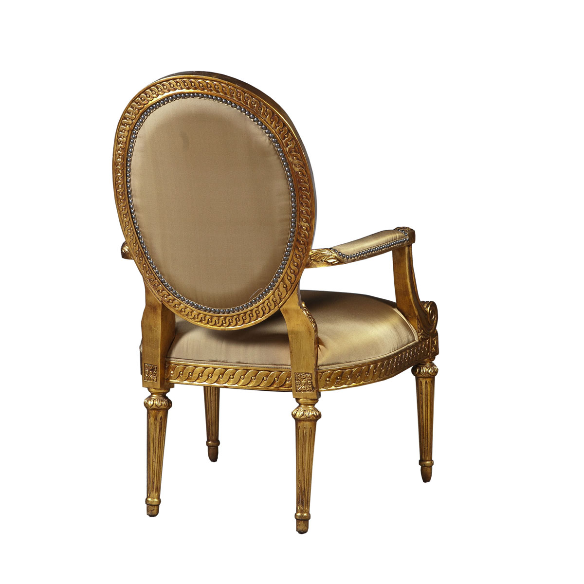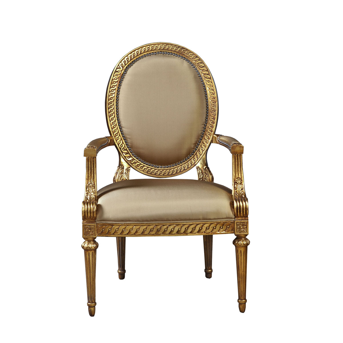 這款休閑椅是參考18世紀(jì)法國(guó)路易十六時(shí)期涂金扶手椅古董設(shè)計(jì),并結(jié)合同時(shí)期的圓面背板設(shè)計(jì)。配上精致的連續(xù)雕刻和貼金鉑工藝、錐形腳設(shè)計(jì)、觸感舒適的布藝和包有豐厚的填充物坐墊和靠背。