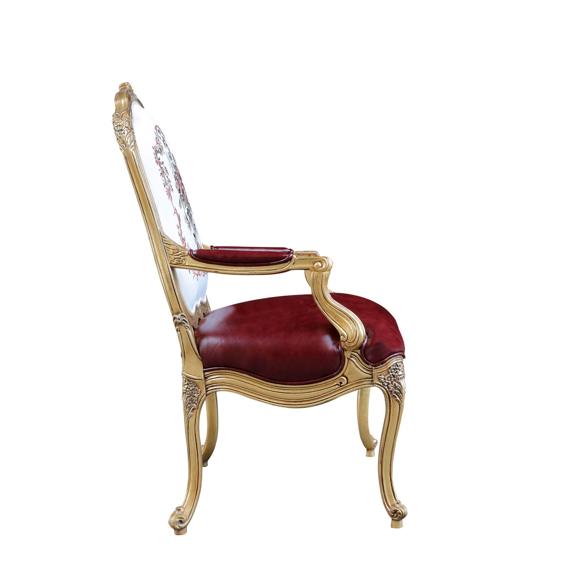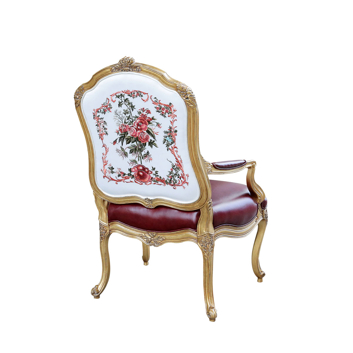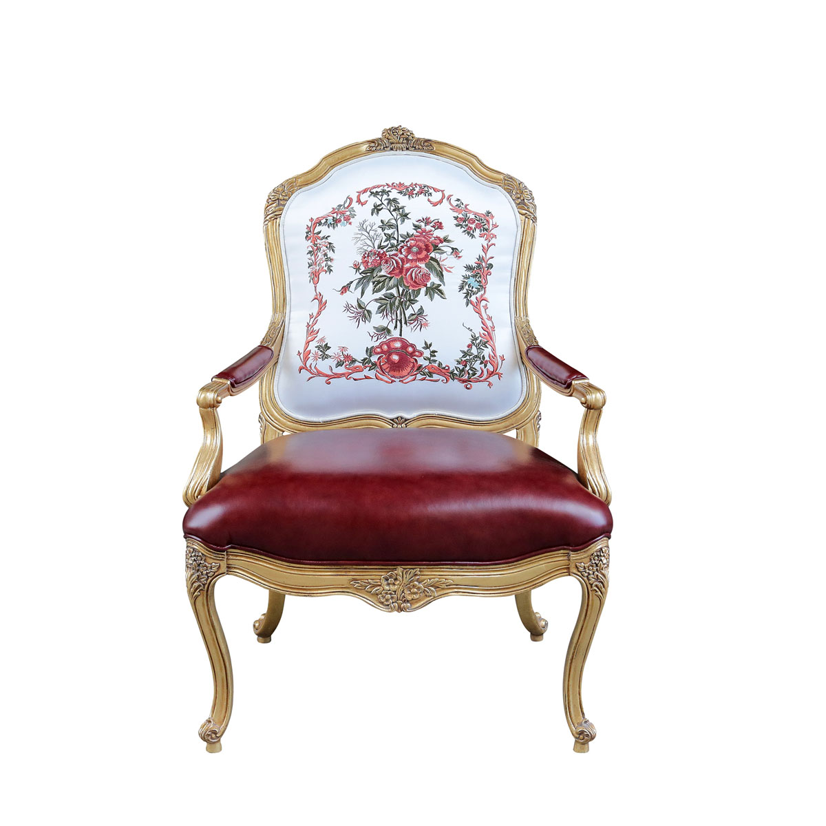 * 以 Louis VX (路易十五)時期洛可可式涂金古董扶手椅為設計靈感,華麗的曲線輪廓配以細膩的雕刻,呈現出法國宮廷的浪漫。不對稱設計的花型布藝設計,更是把洛可可風格的美表達得淋漓盡致。