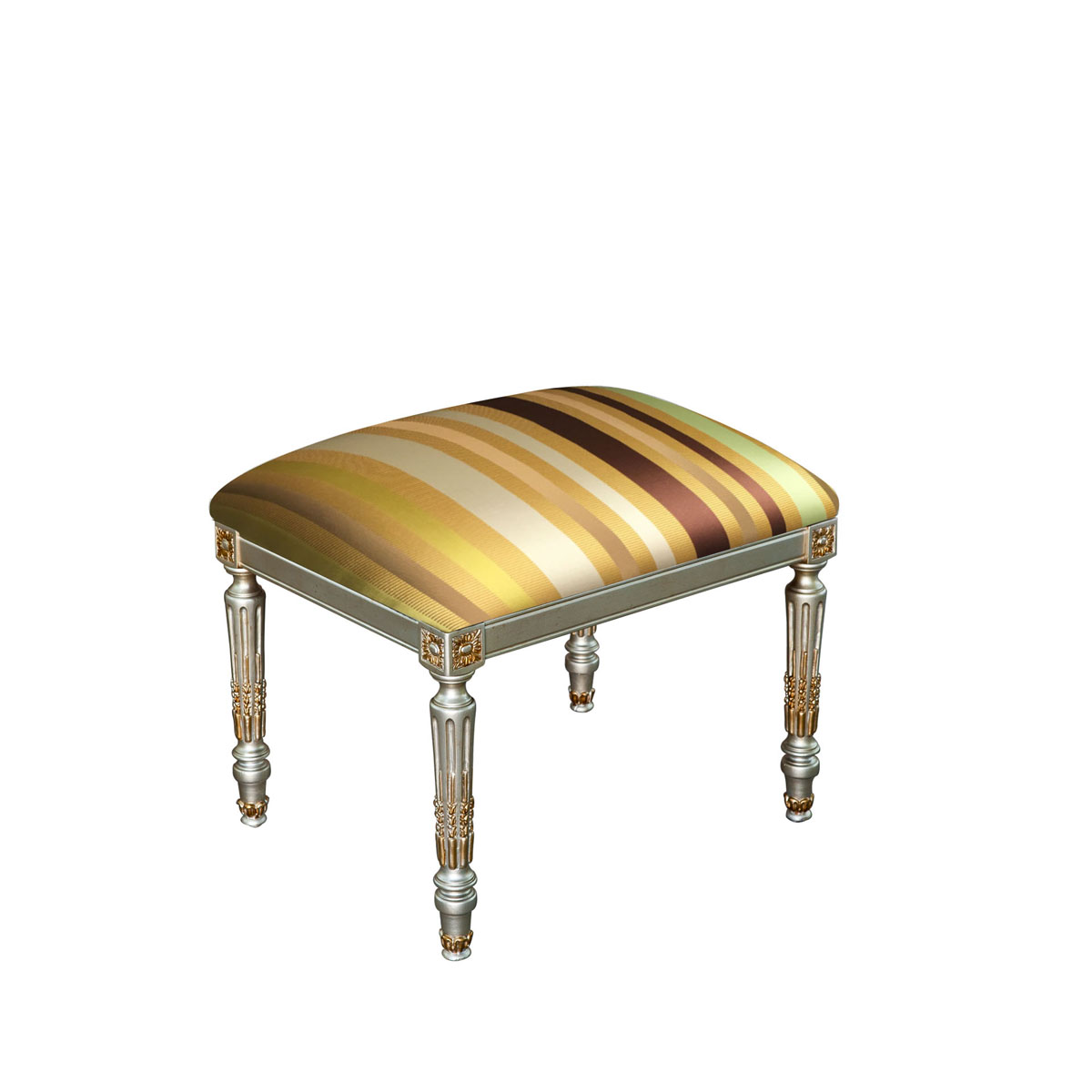 * 為表現(xiàn)法國(guó)路易時(shí)期的莊嚴(yán)和浪漫,以法國(guó)凡爾賽宮為設(shè)計(jì)元素;使用歌頌路易十四時(shí)期的太陽(yáng)花雕刻;路易十六時(shí)期的建筑柱雕刻;顯示其王權(quán)穩(wěn)固地位的錐形腿腳設(shè)計(jì),配以高貴的銀底金漆配搭、豐富觸感的布藝面料和厚實(shí)柔軟的填充物,是豪華系列凡爾賽玫瑰法式梳妝凳的特色;