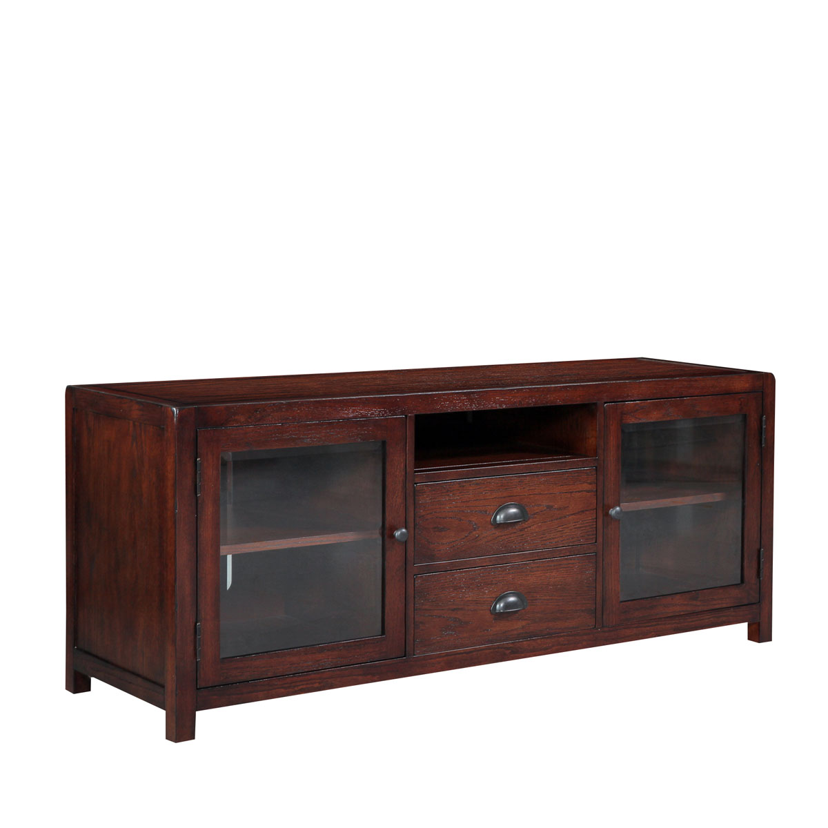 * 中間兩個儲物抽斗,其底部采用鐵路軌可以將CD和DVD碟更好分類存放 * 左右兩邊為實木框玻璃門,門內有一塊可調木層板