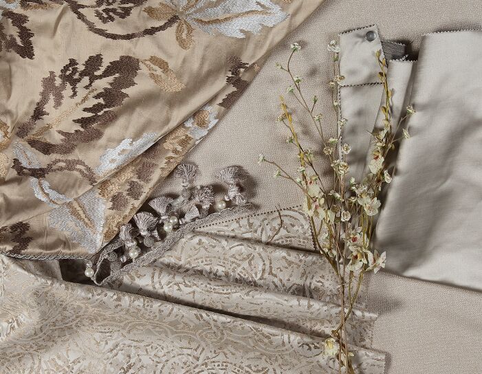 亞麻、絲綢、純棉等多樣的面料材質,層次分明,厚薄相兼。立體布藝和提花刺繡更顯輕盈,同時將濃厚的藝術底蘊盡現,在法式灰的映襯下雅致中帶著侯爵夫人般的貴氣。